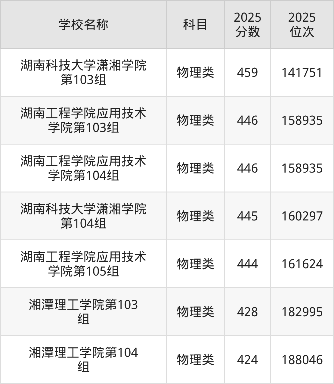 下文为2025年湘潭市民办二本大学在湖南物理类录取分数线和位次排名表,供大家参考: