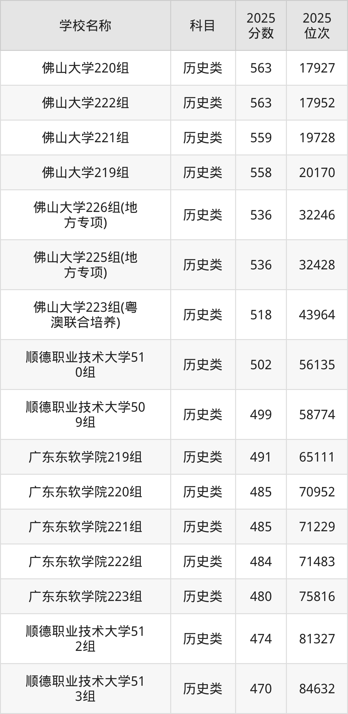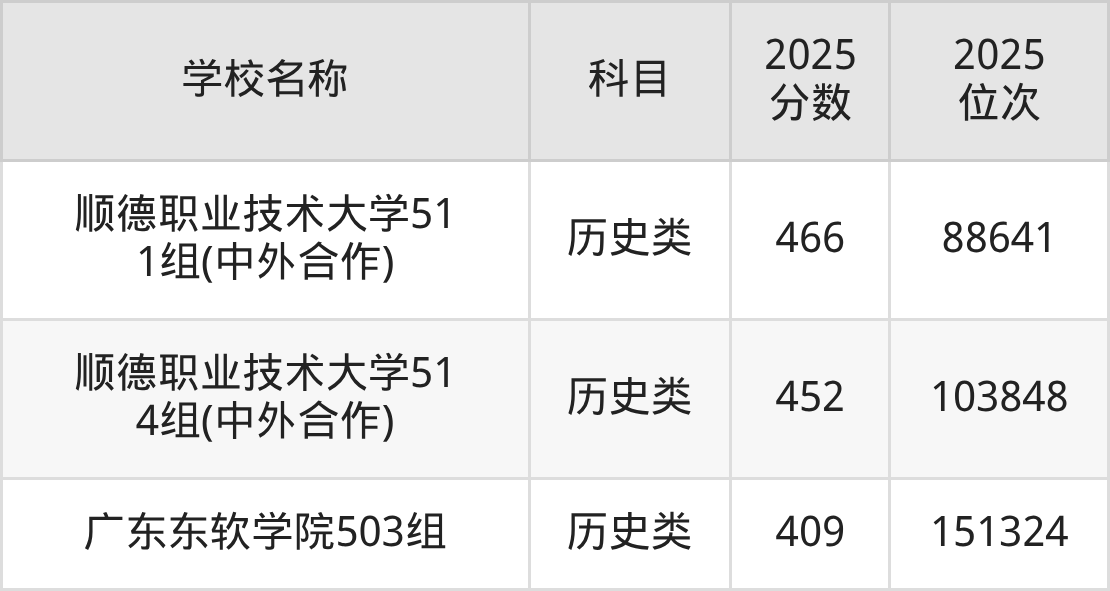 下文为2025年佛山市本科大学在广东历史类录取分数线和位次排名表,供大家参考:
