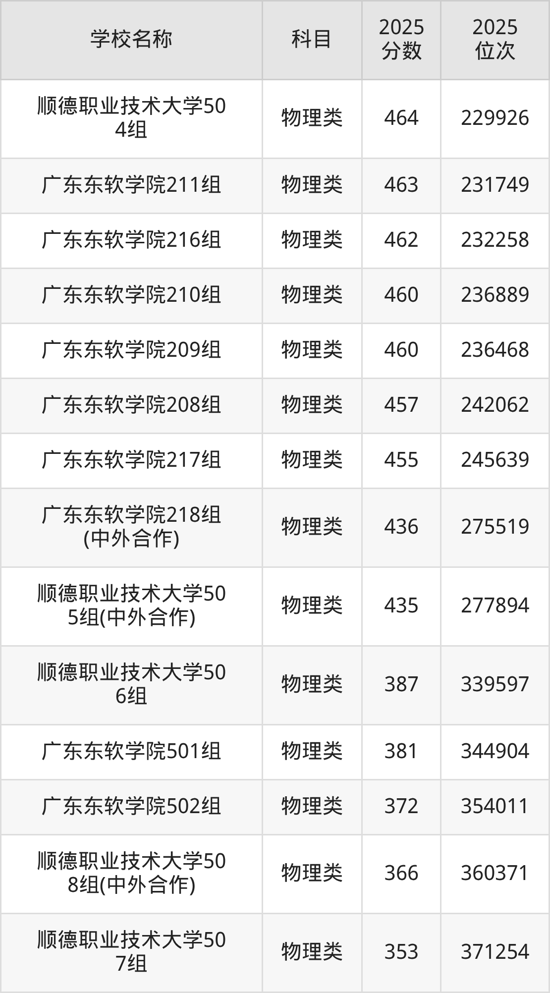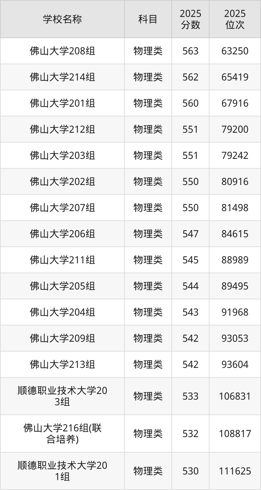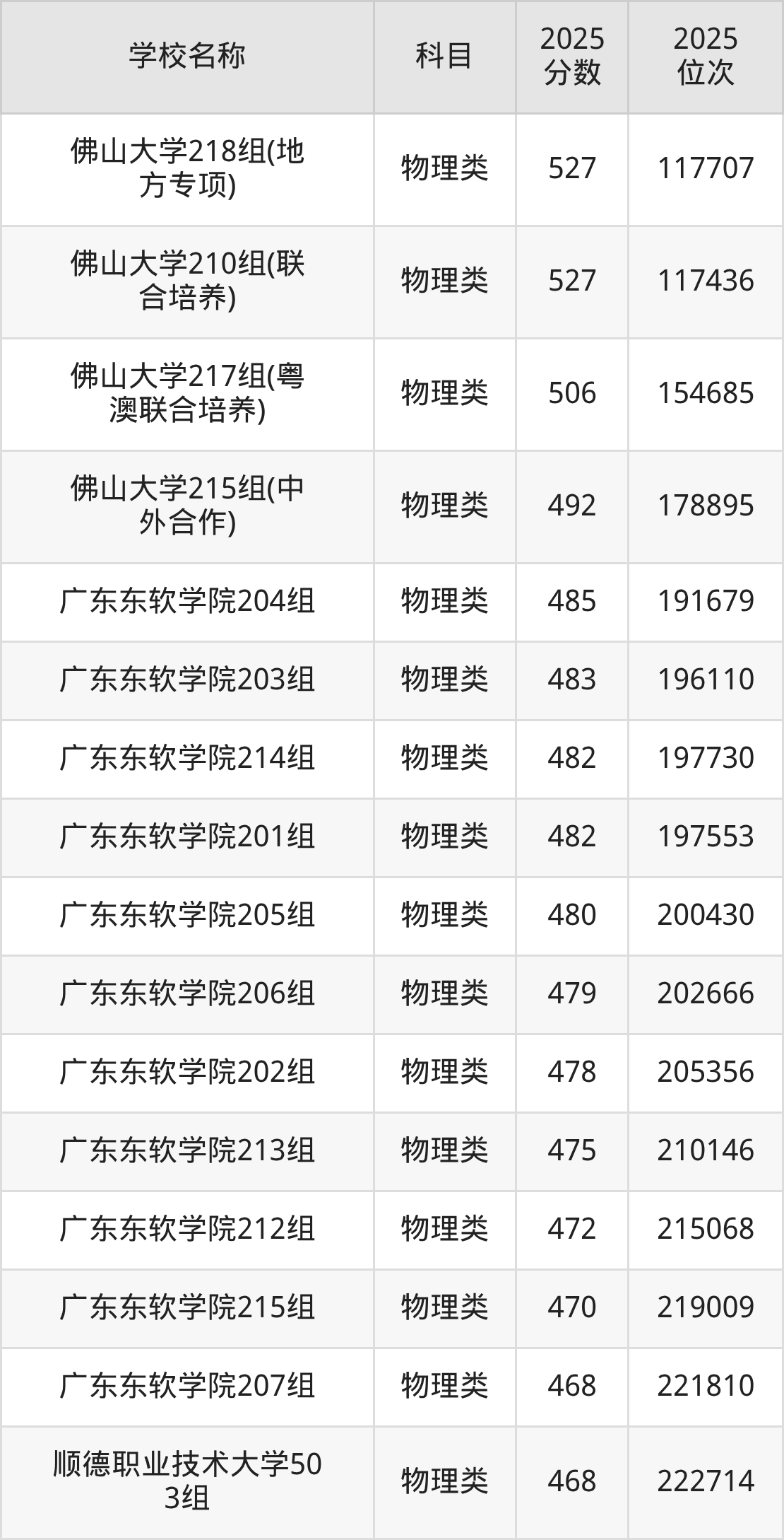 下文为2025年佛山市本科大学在广东物理类录取分数线和位次排名表,供大家参考: