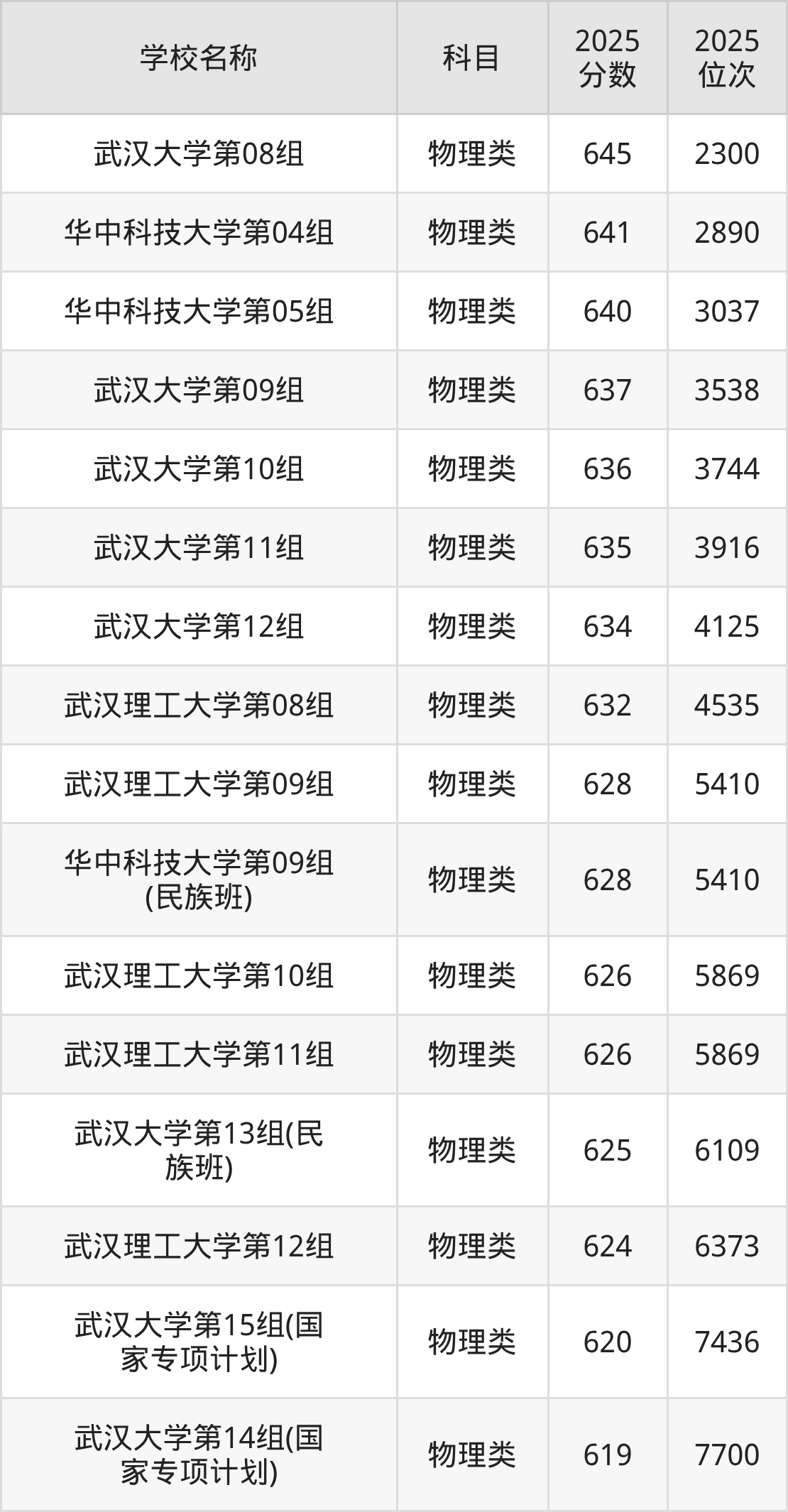 下文为2025年武汉市双一流大学在湖北物理类录取分数线和位次排名表,供大家参考: