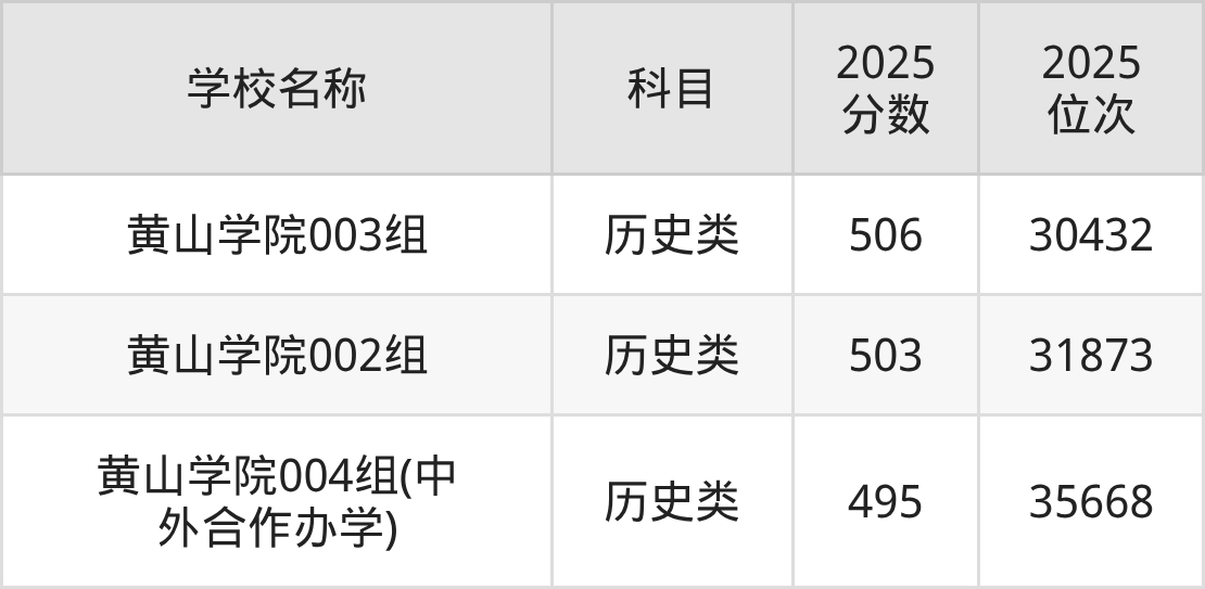 下文为2025年黄山市本科大学在安徽历史类录取分数线和位次排名表,供大家参考: