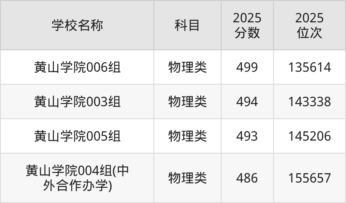下文为2025年黄山市本科大学在安徽物理类录取分数线和位次排名表,供大家参考: