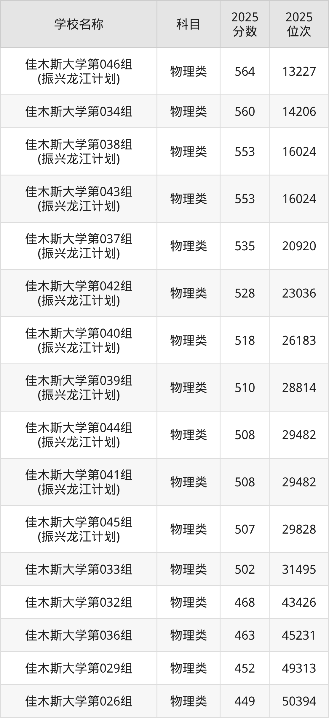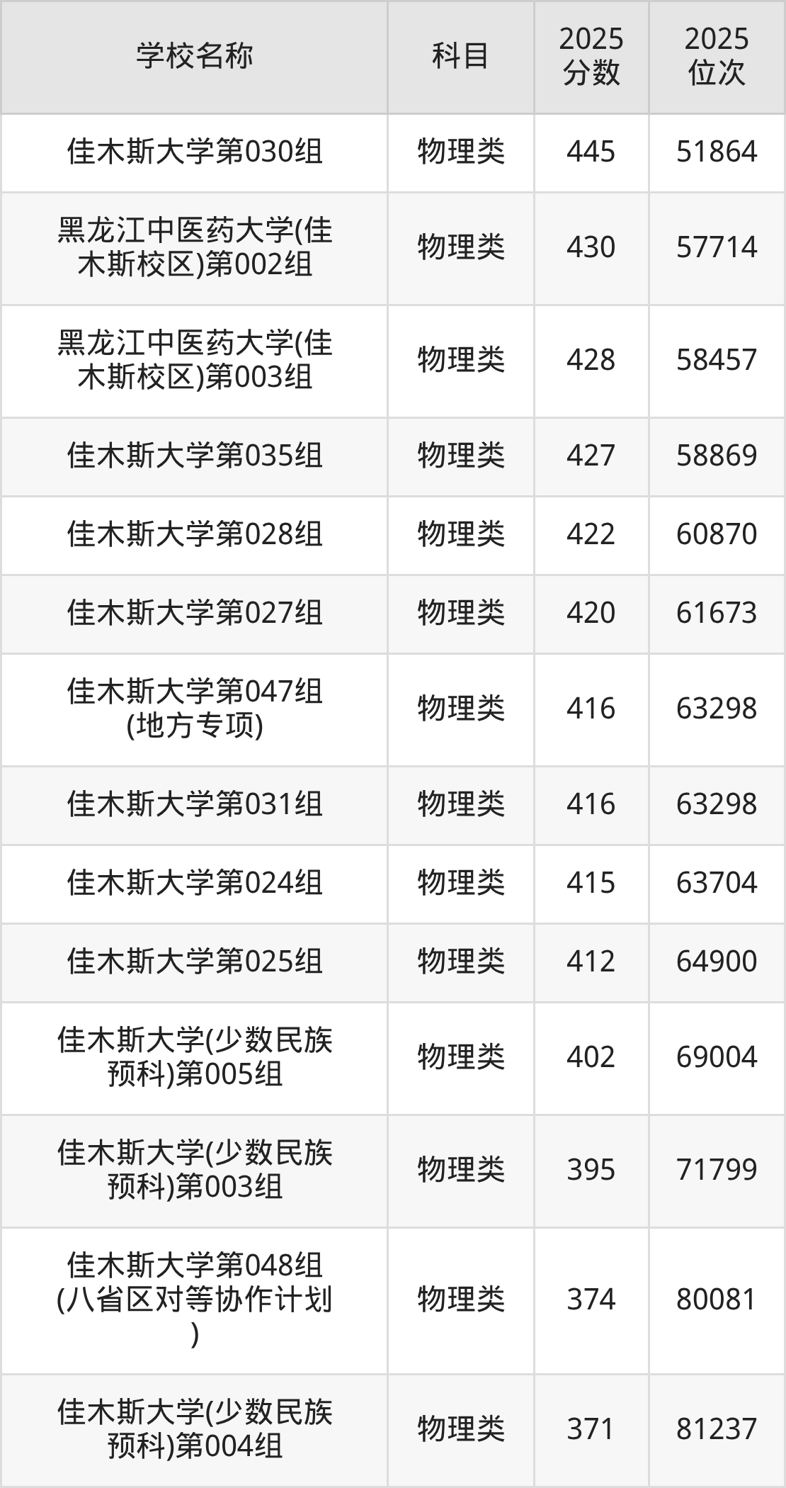 下文为2025年佳木斯市本科大学在黑龙江物理类录取分数线和位次排名表,供大家参考: