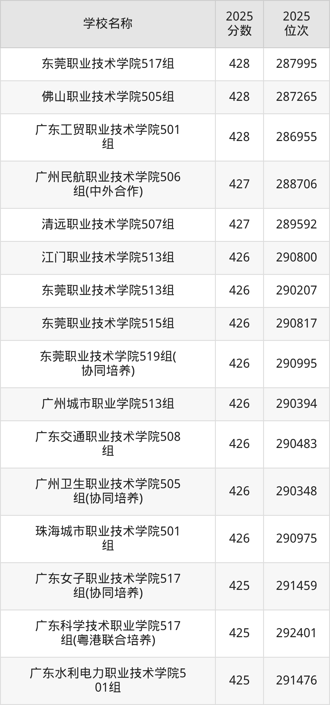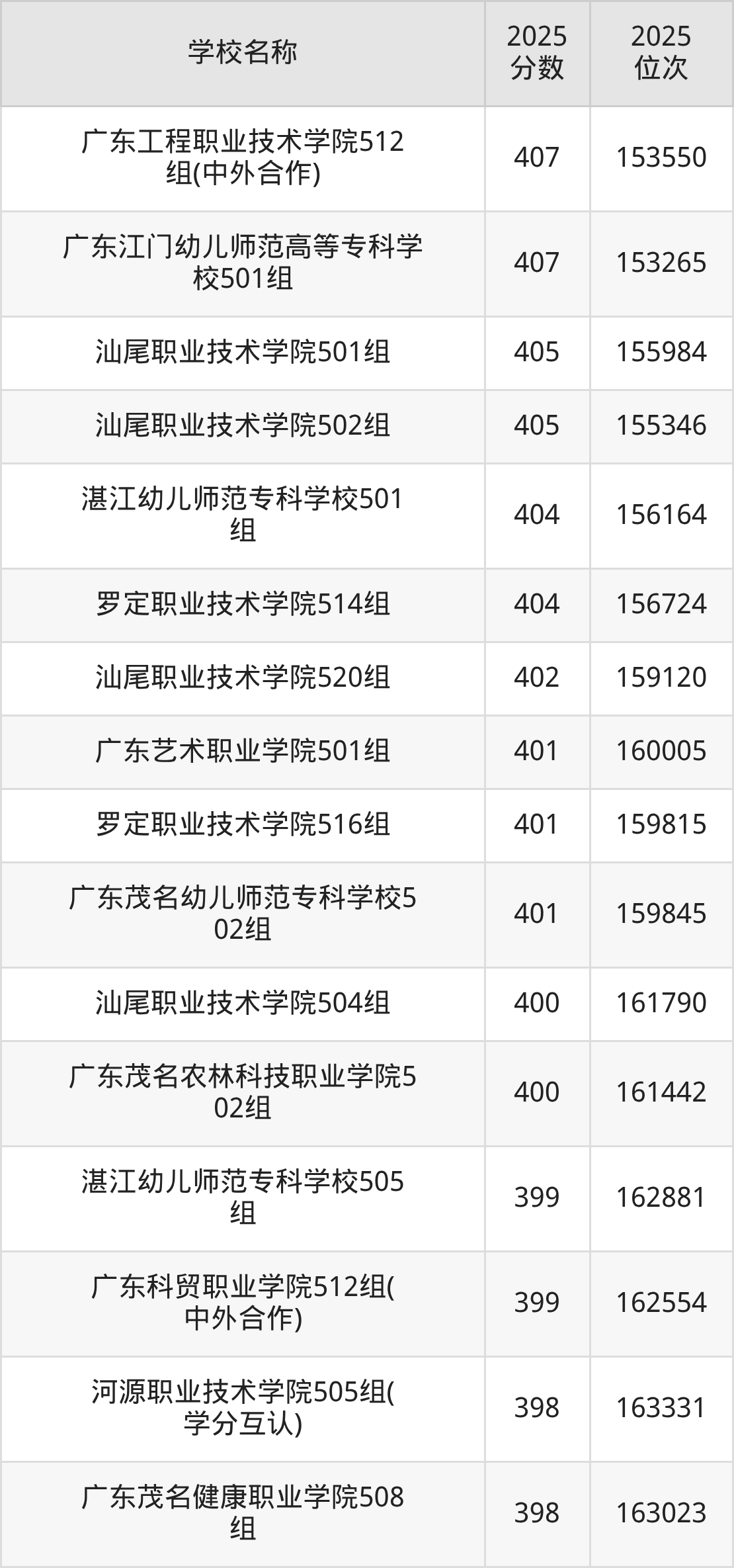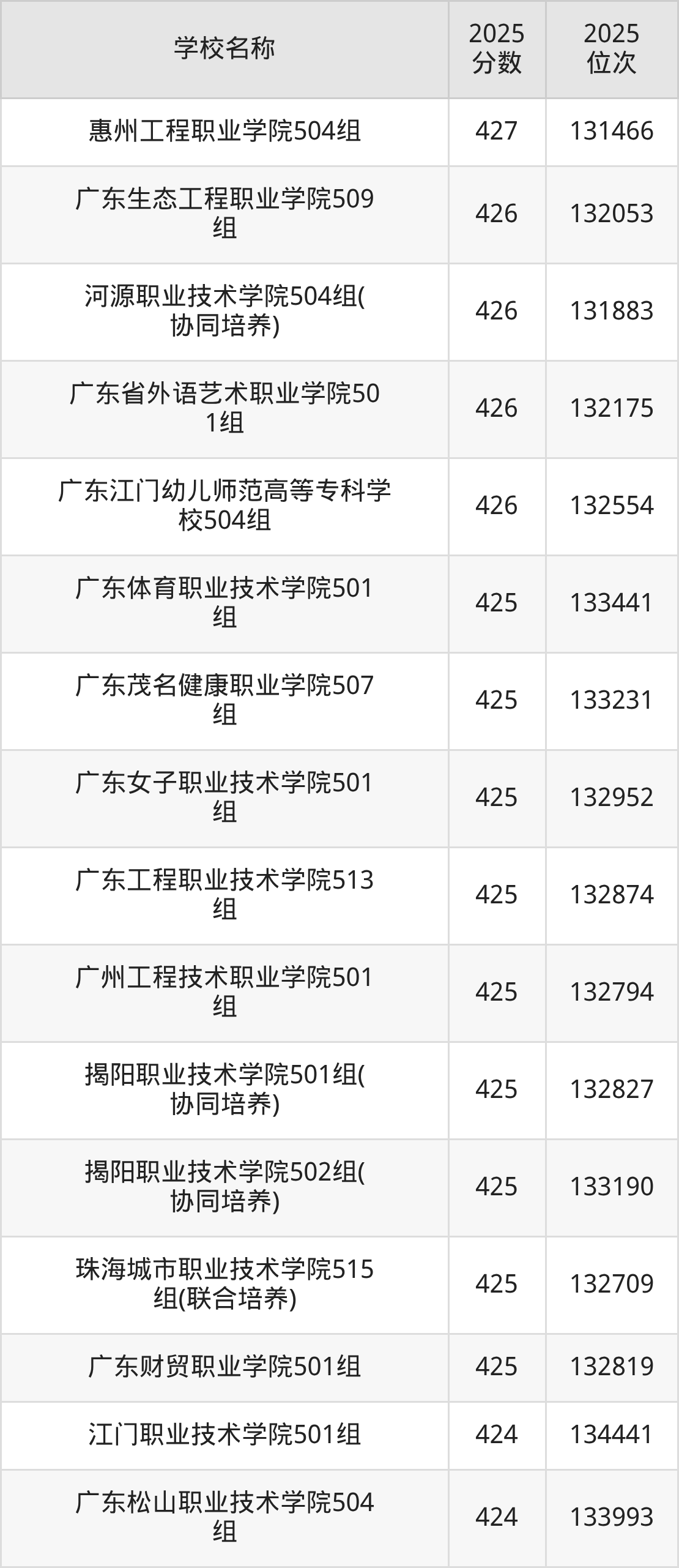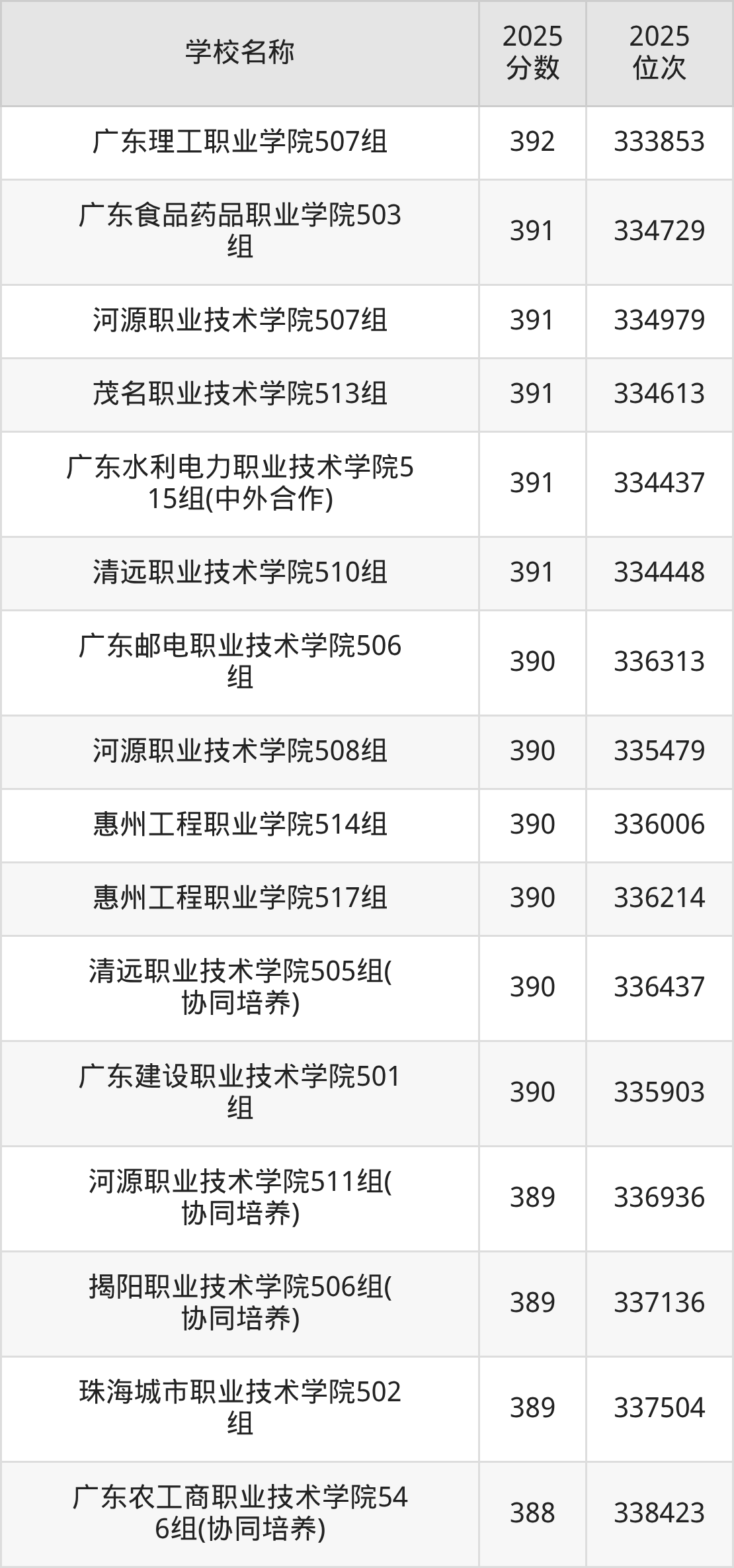 下文为2025年广东省公办专科大学在广东物理类录取分数线和位次排名表,供大家参考: