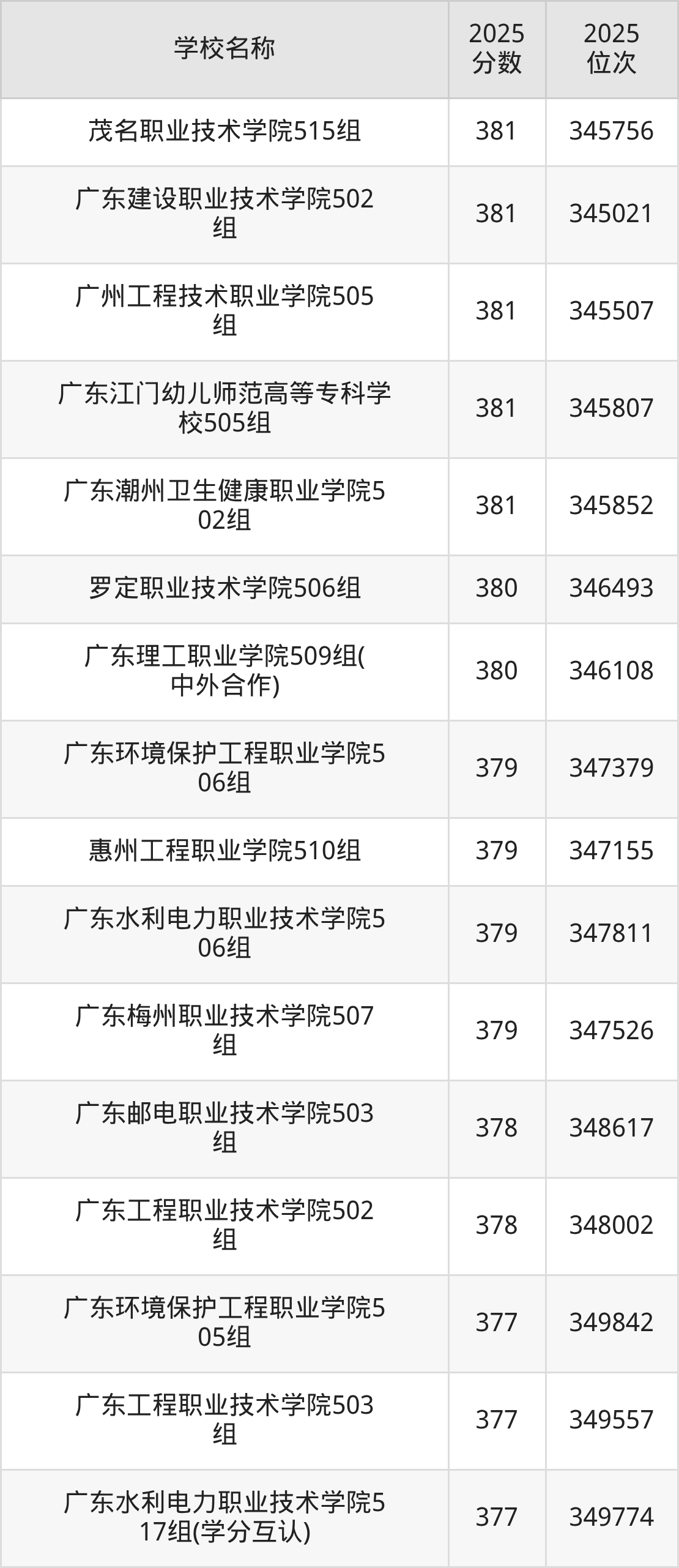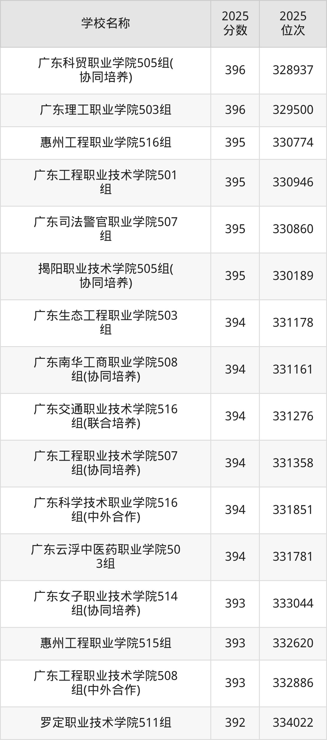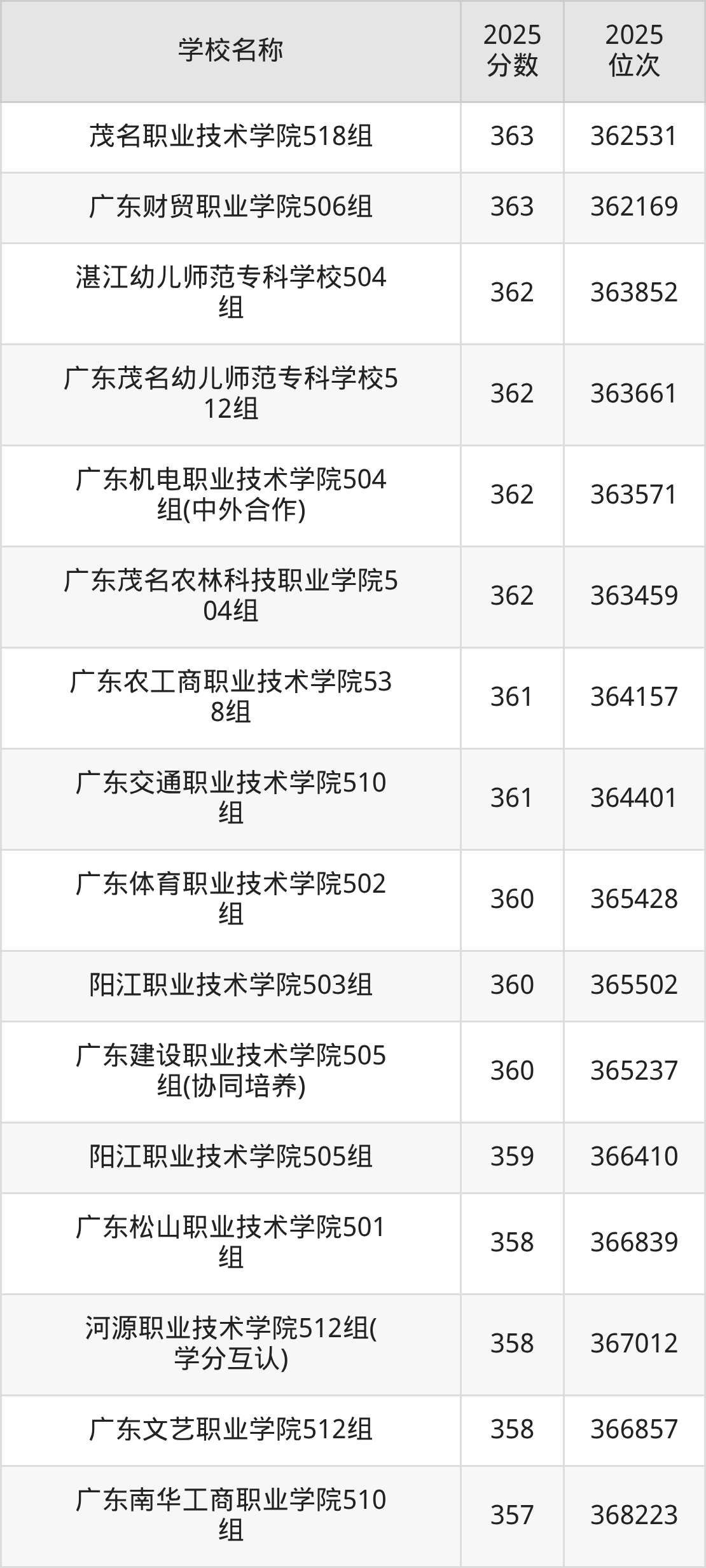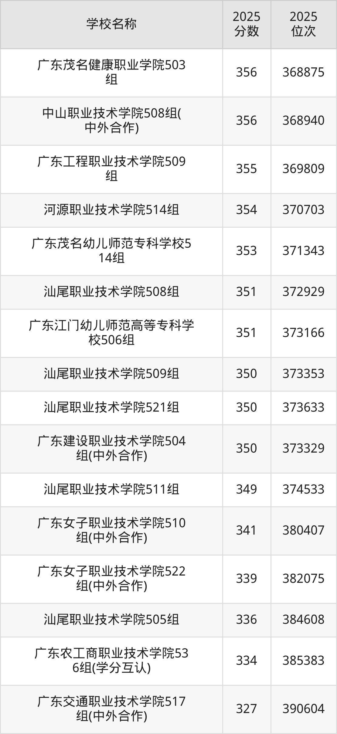 下文为2025年广东省公办专科大学在广东物理类录取分数线和位次排名表,供大家参考: