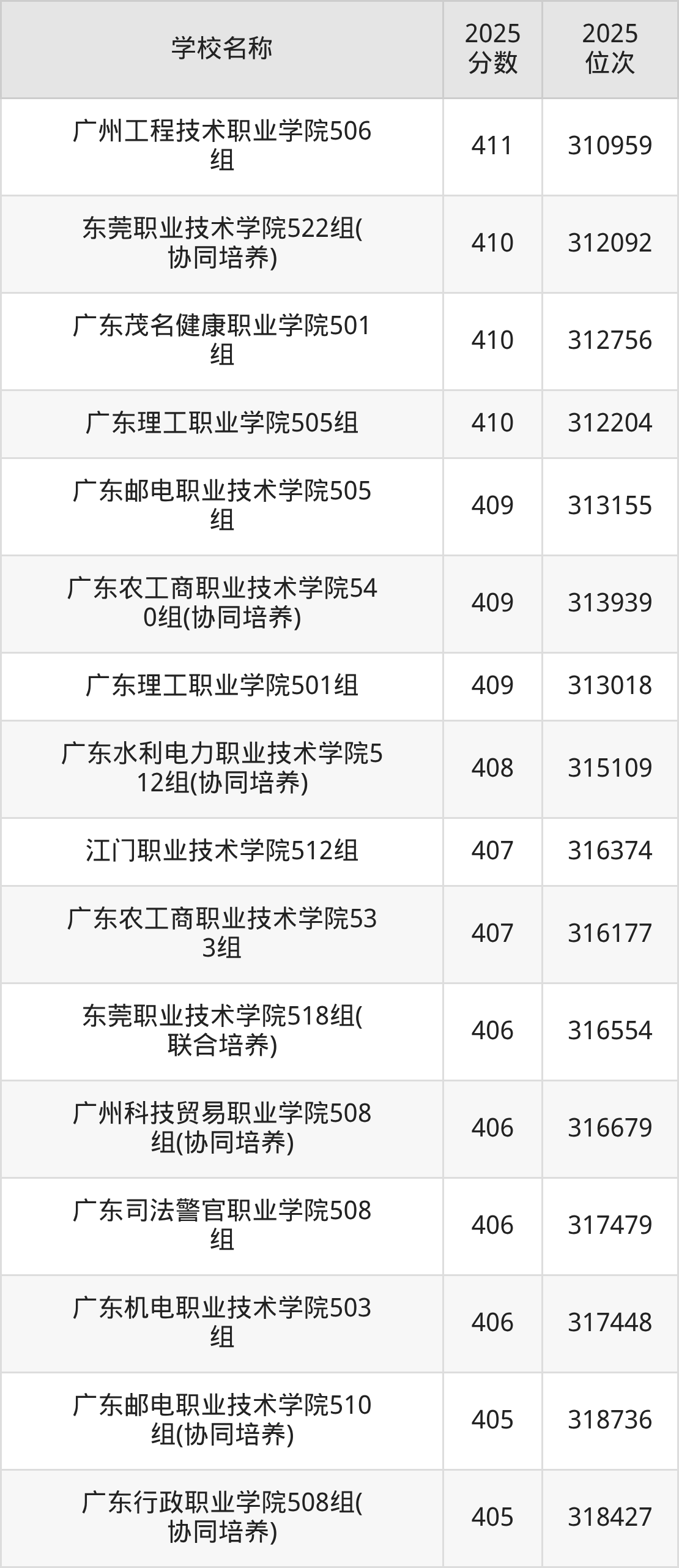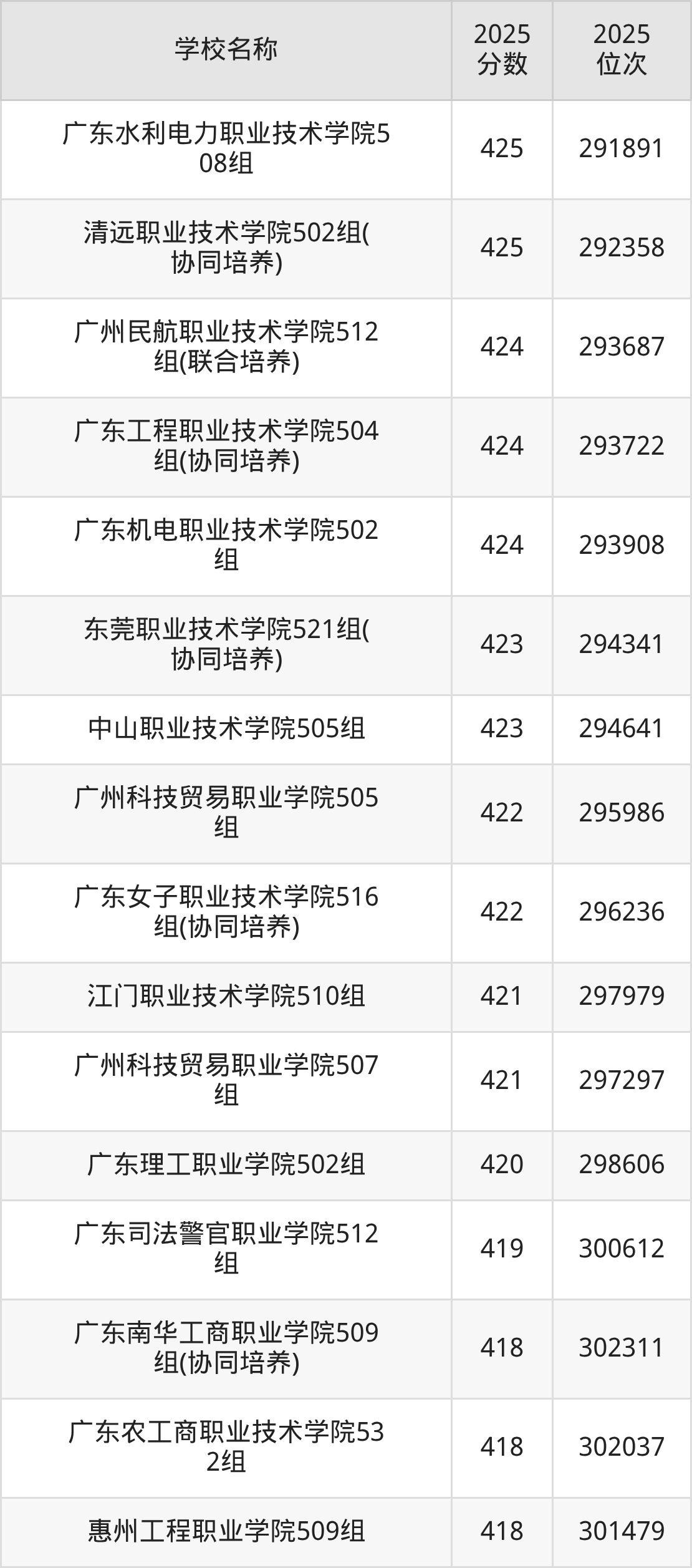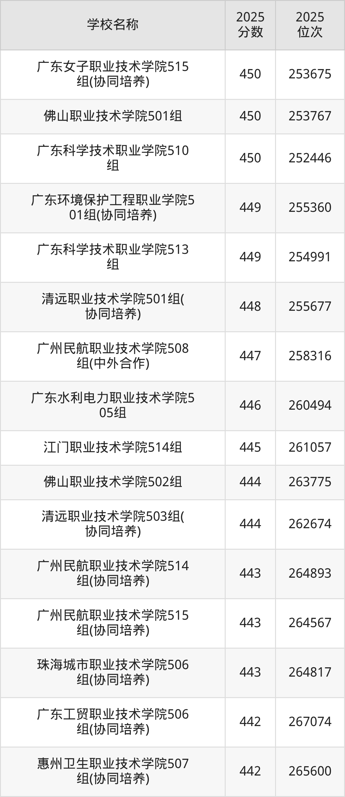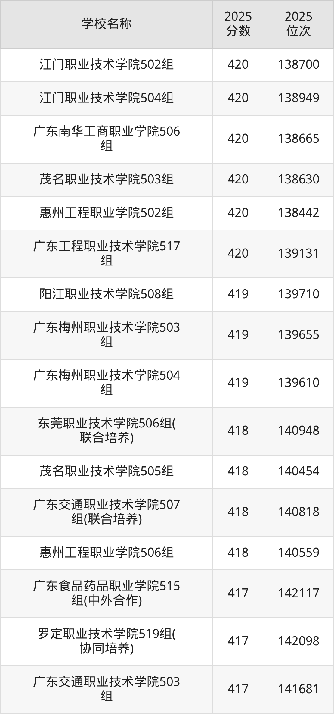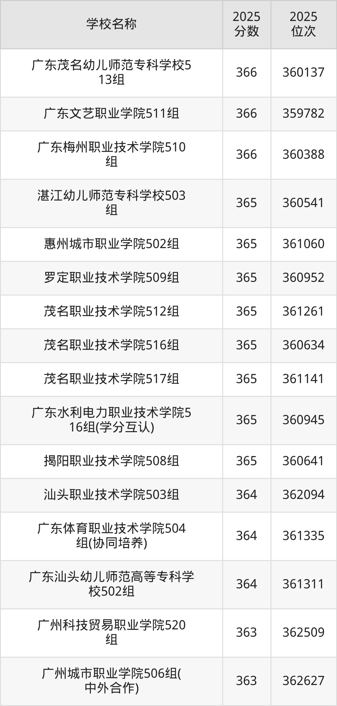 下文为2025年广东省公办专科大学在广东物理类录取分数线和位次排名表,供大家参考: