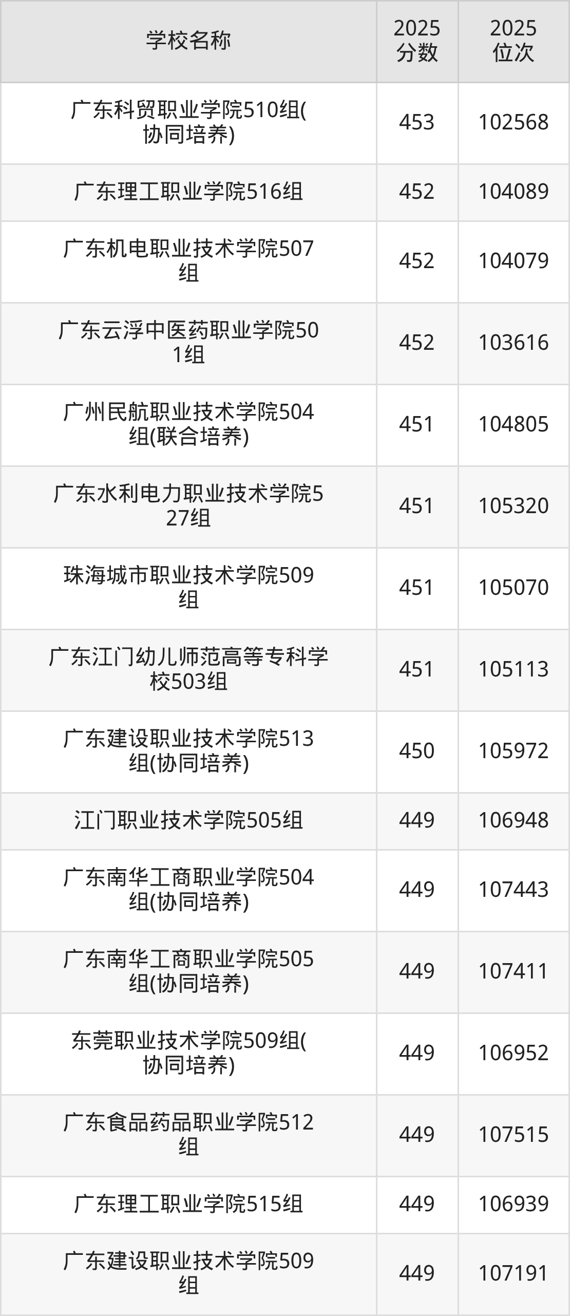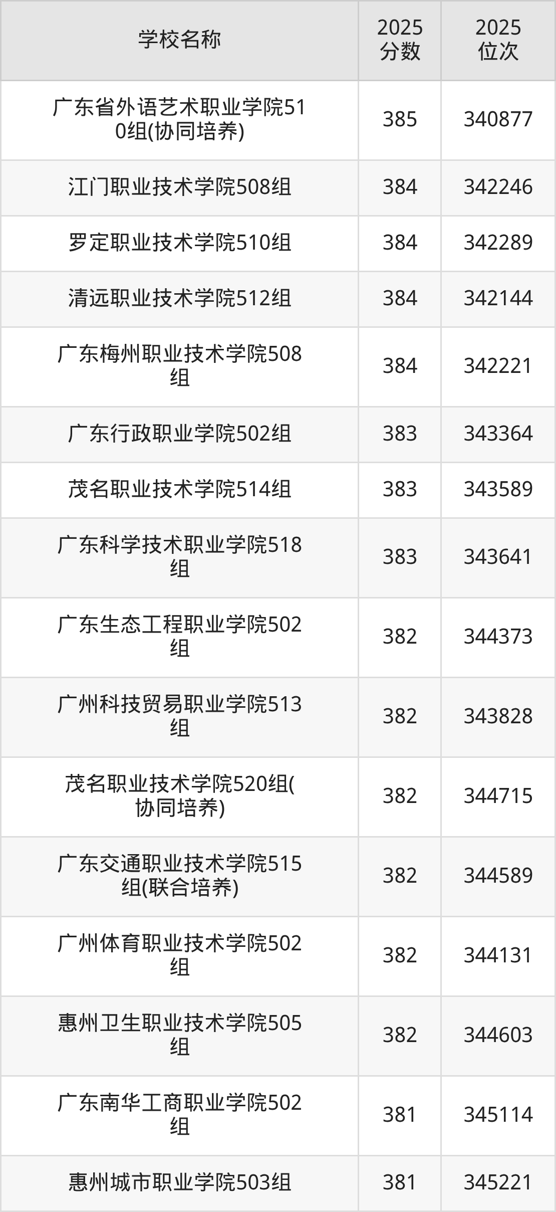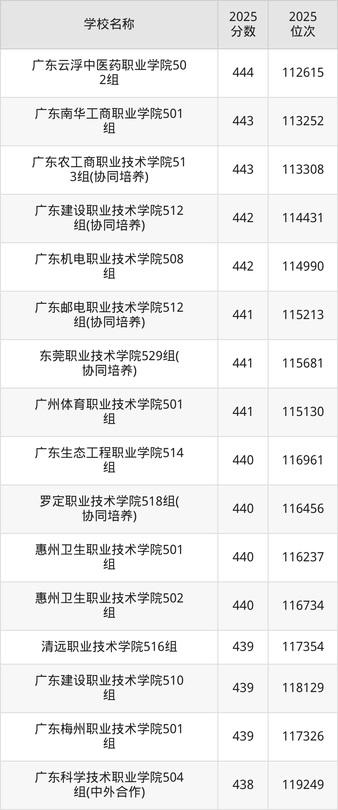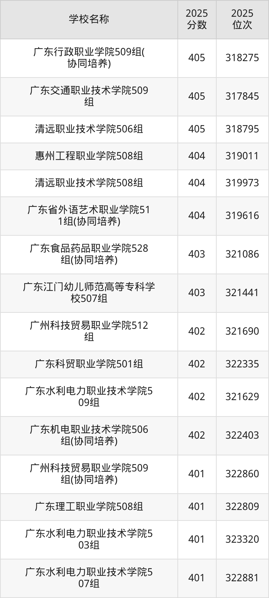 下文为2025年广东省公办专科大学在广东物理类录取分数线和位次排名表,供大家参考: