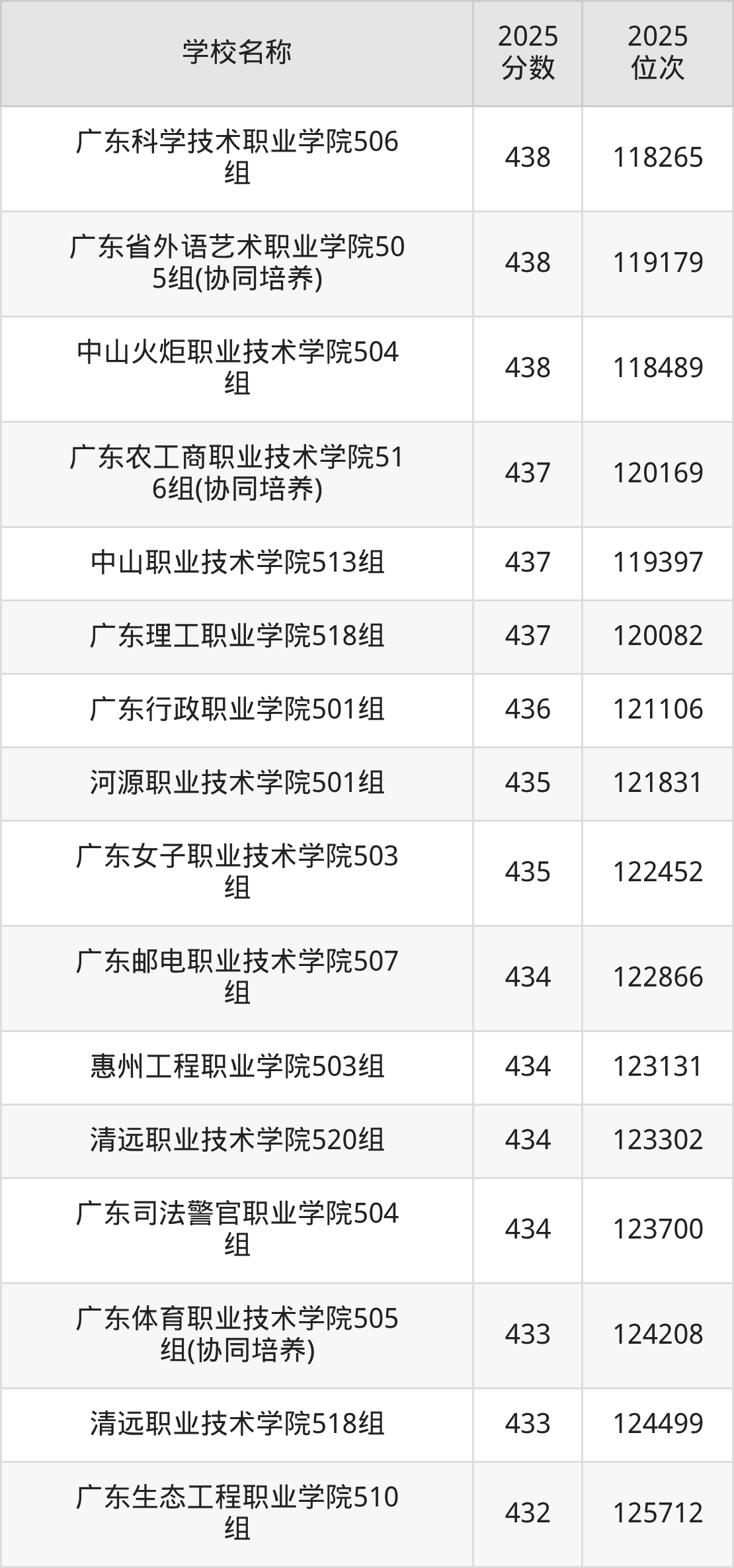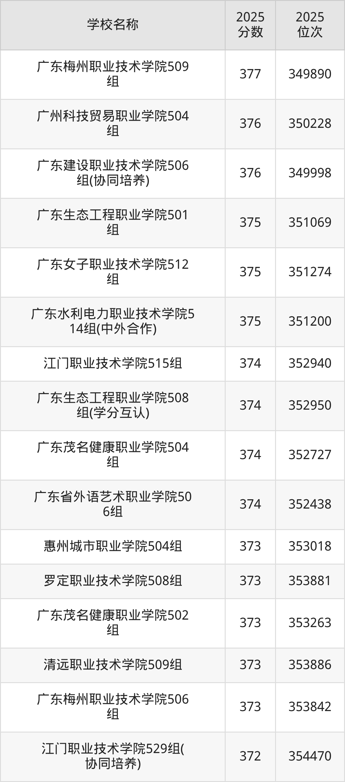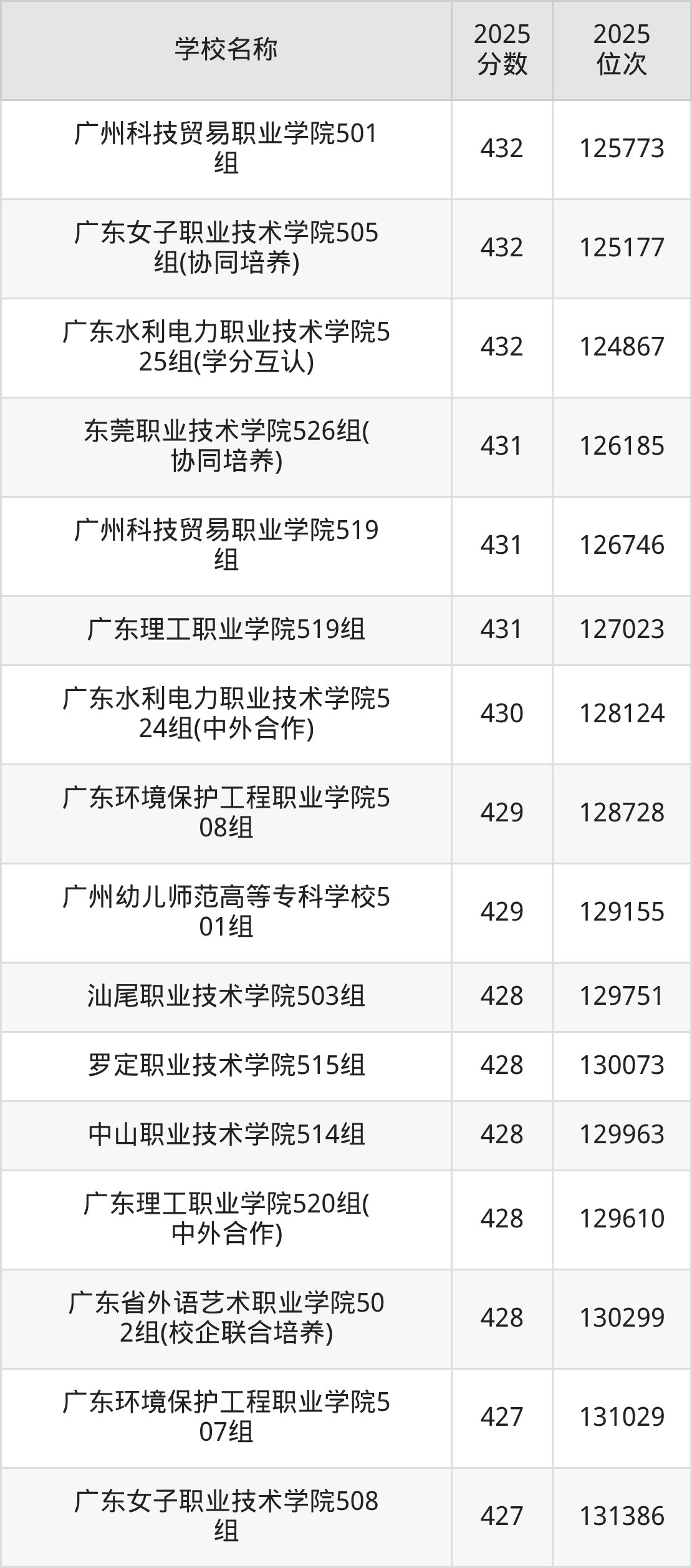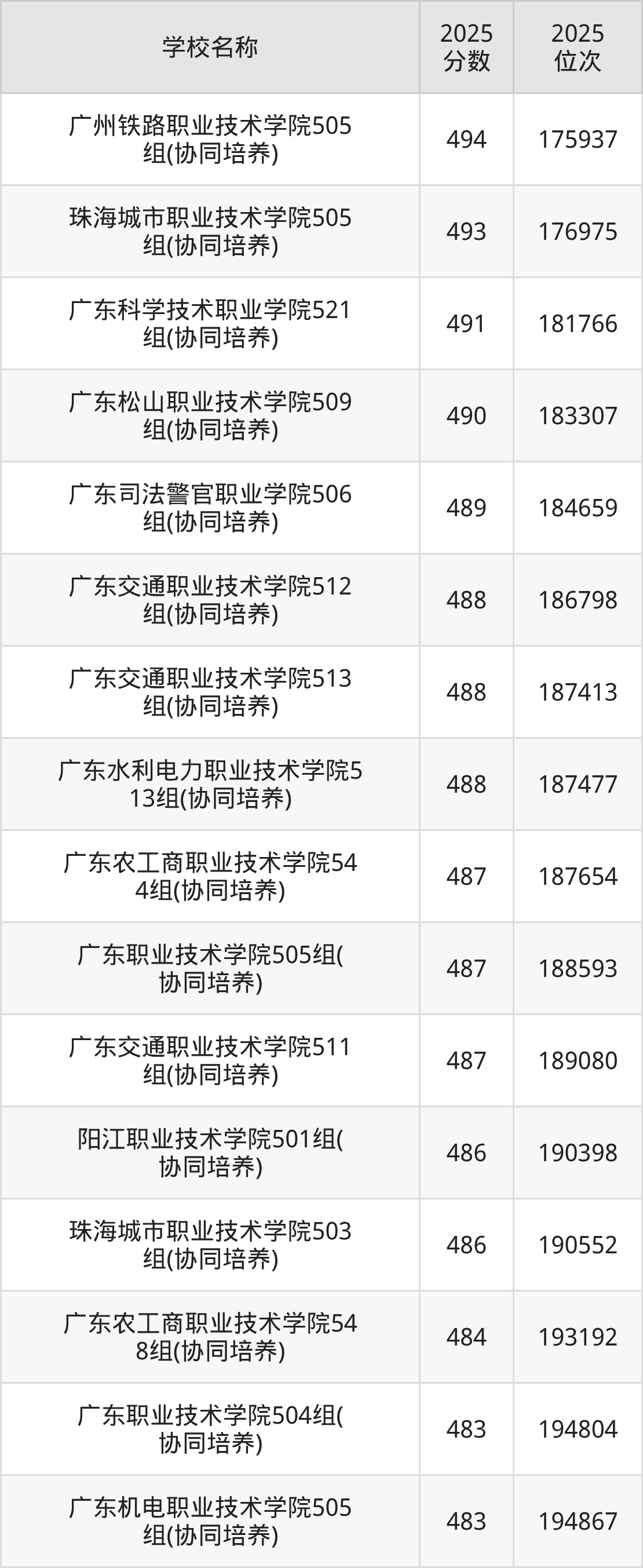 下文为2025年广东省公办专科大学在广东物理类录取分数线和位次排名表,供大家参考: