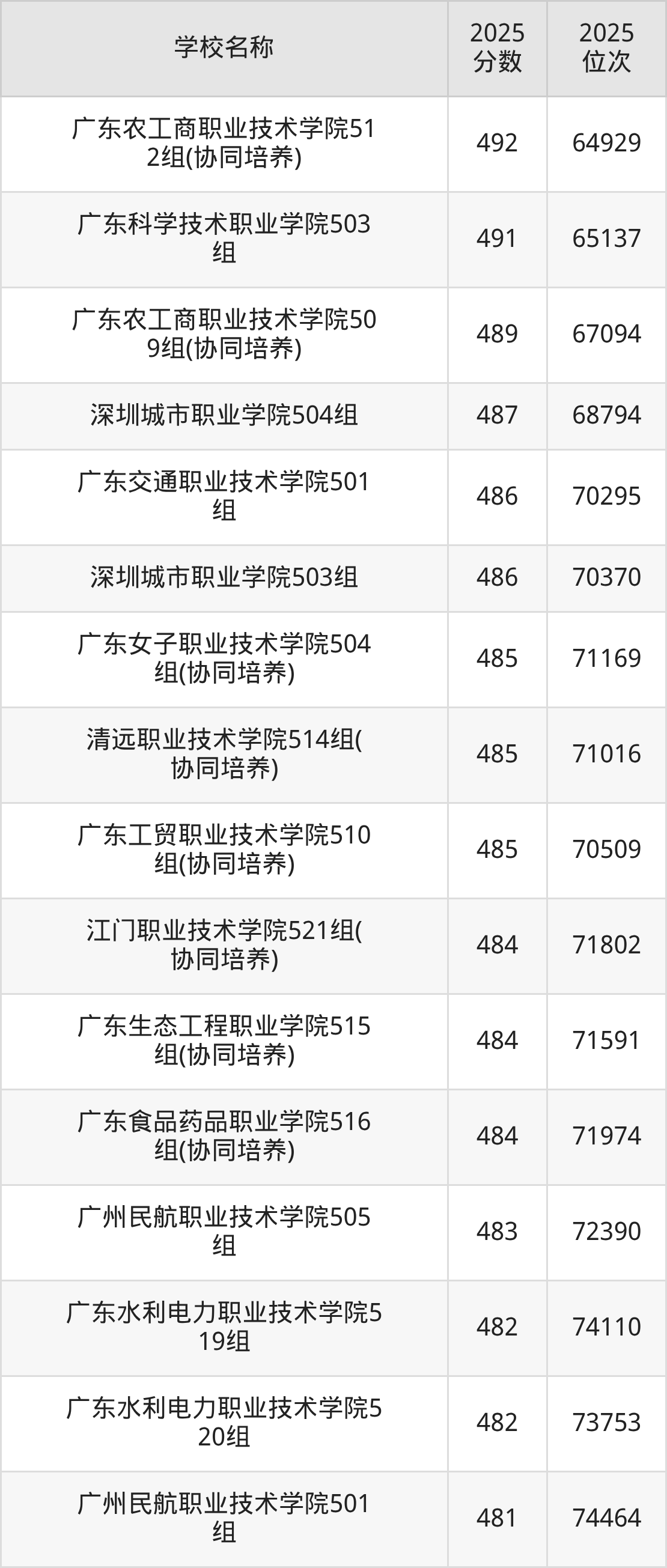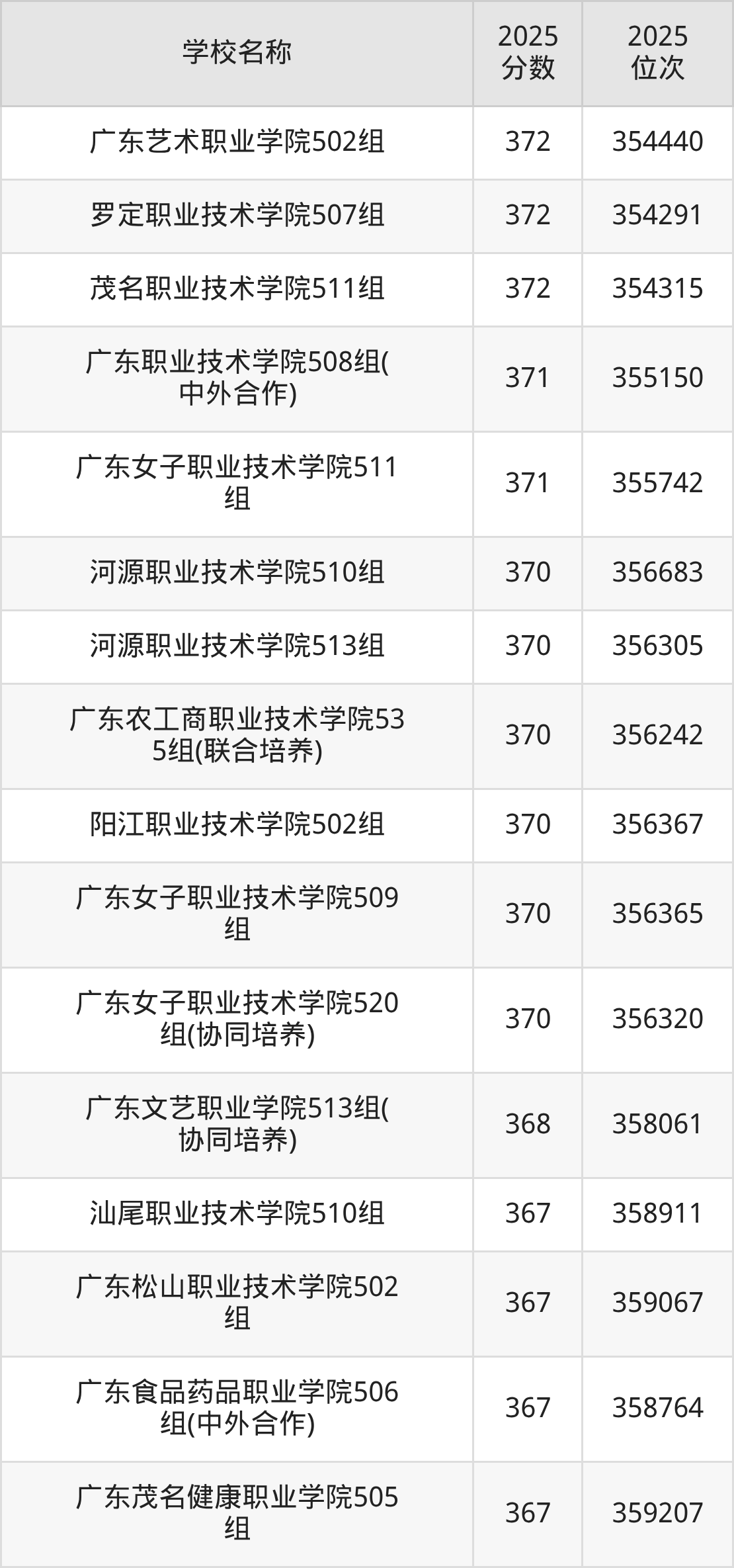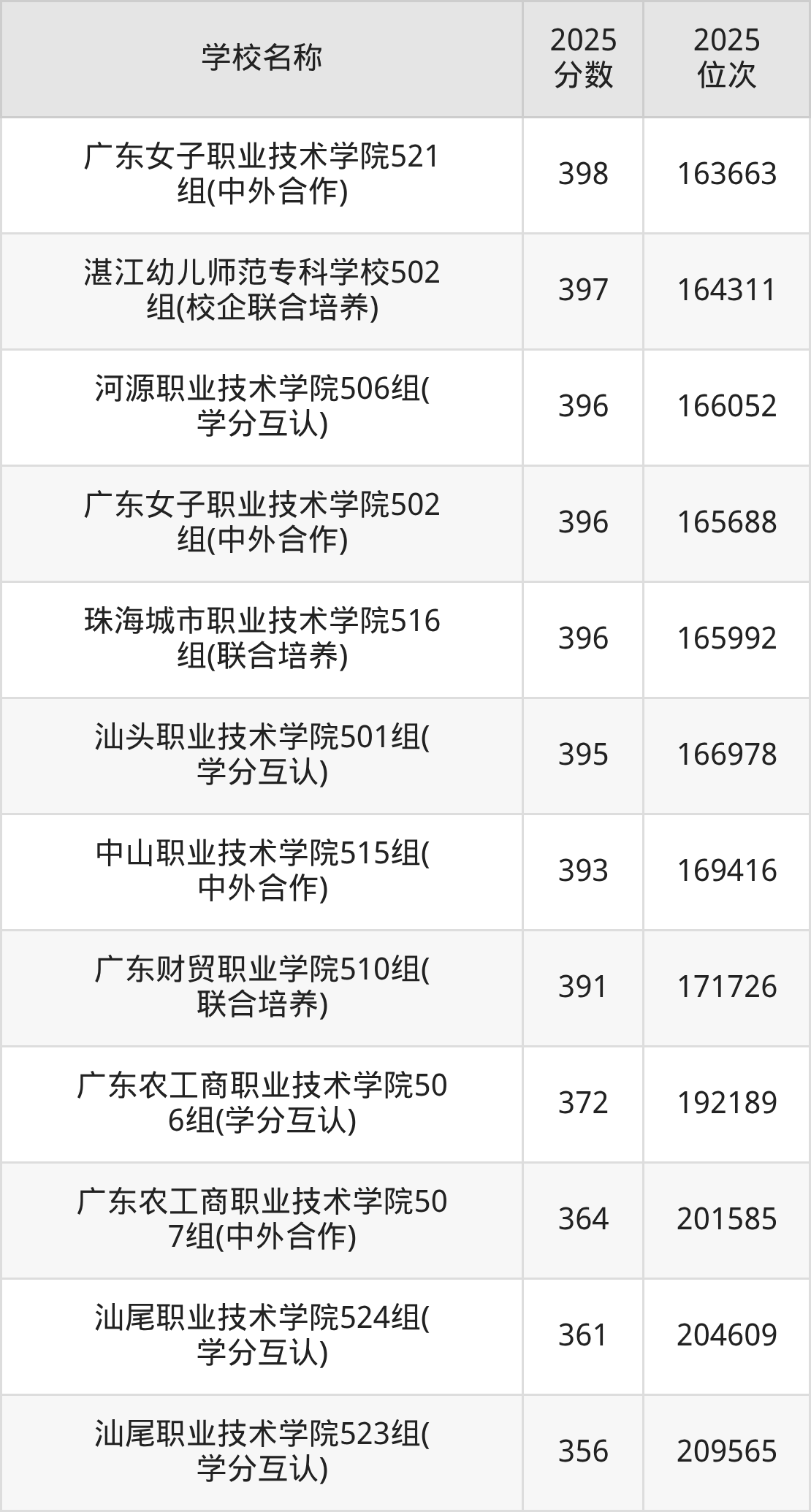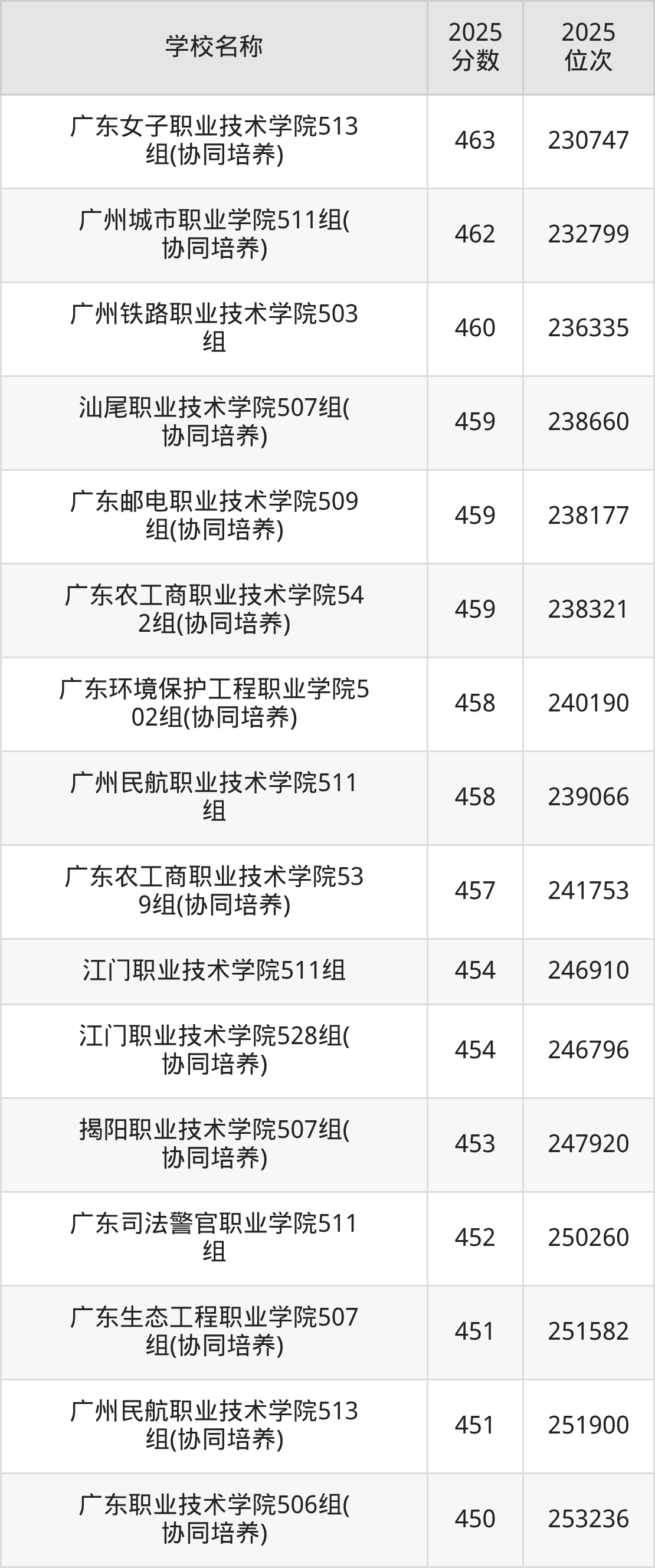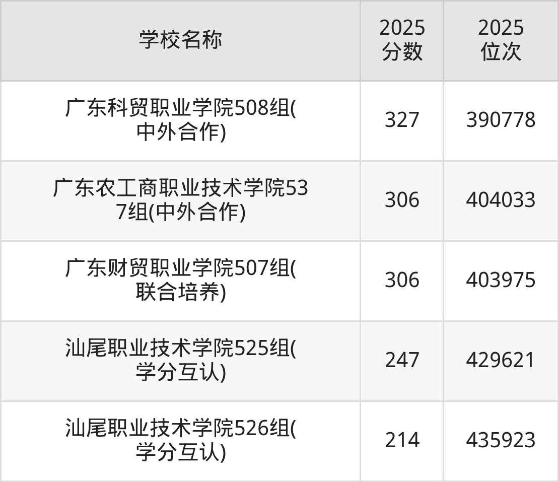 下文为2025年广东省公办专科大学在广东历史类录取分数线和位次排名表,供大家参考:
