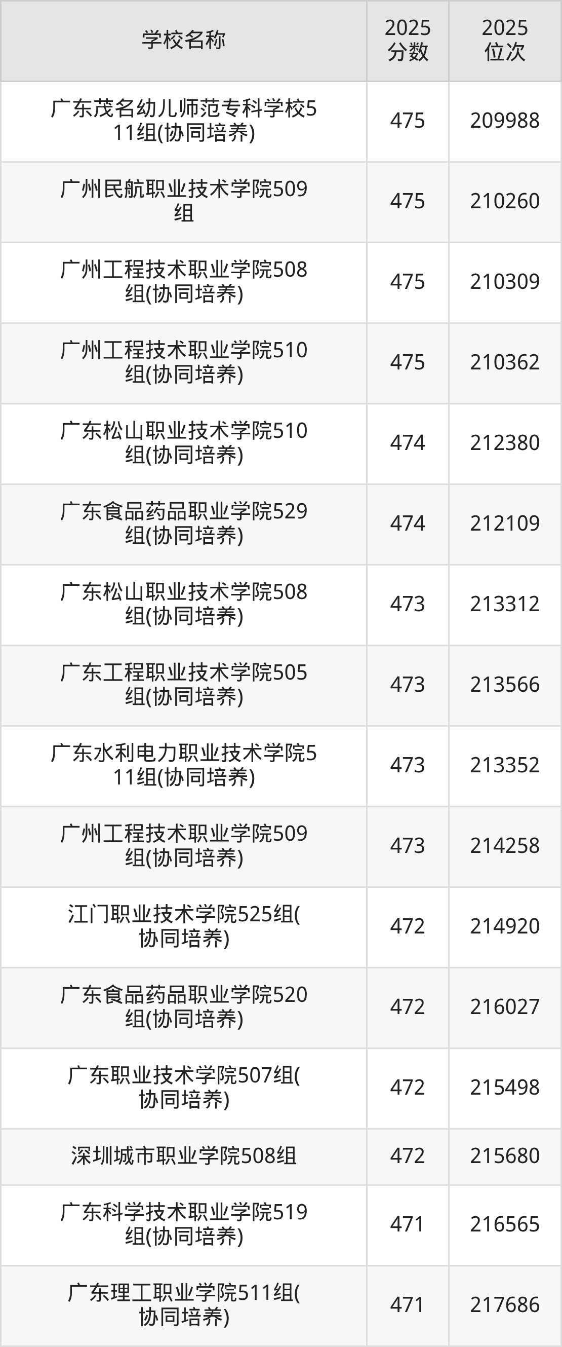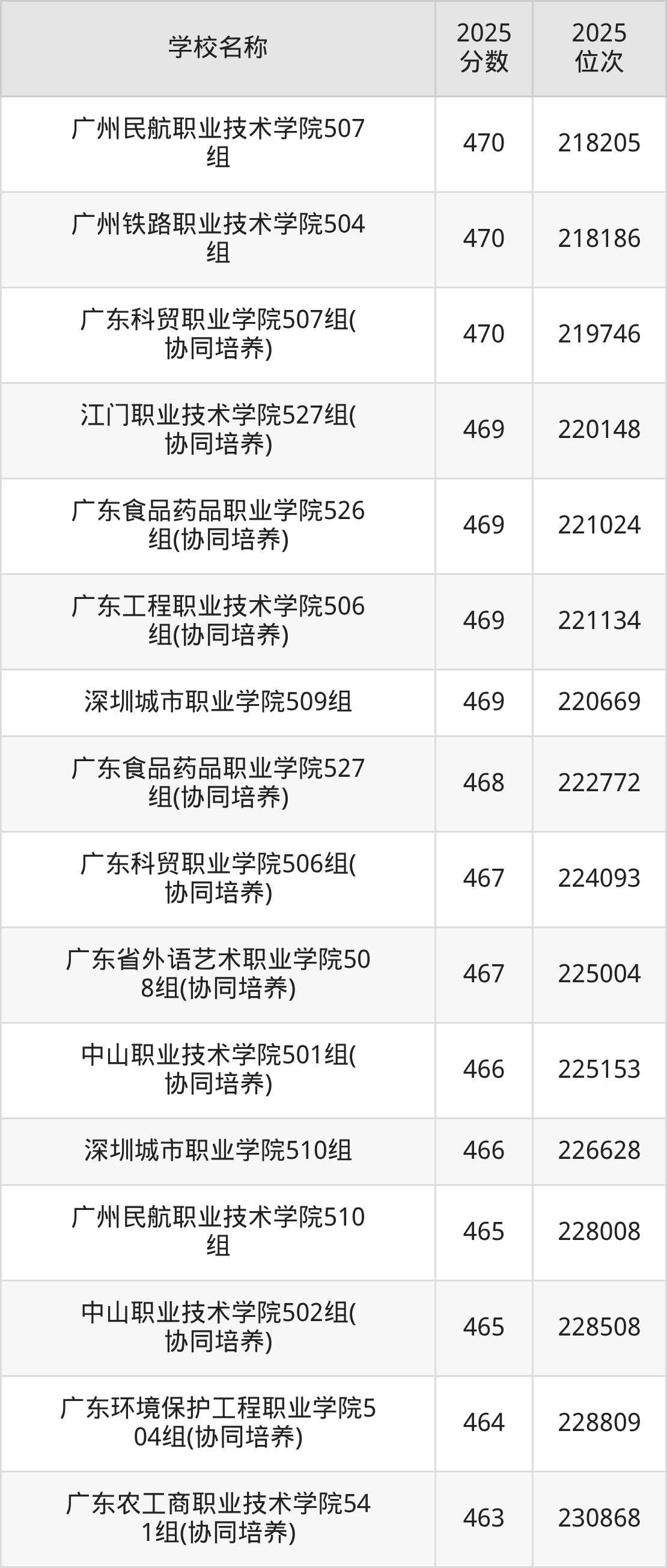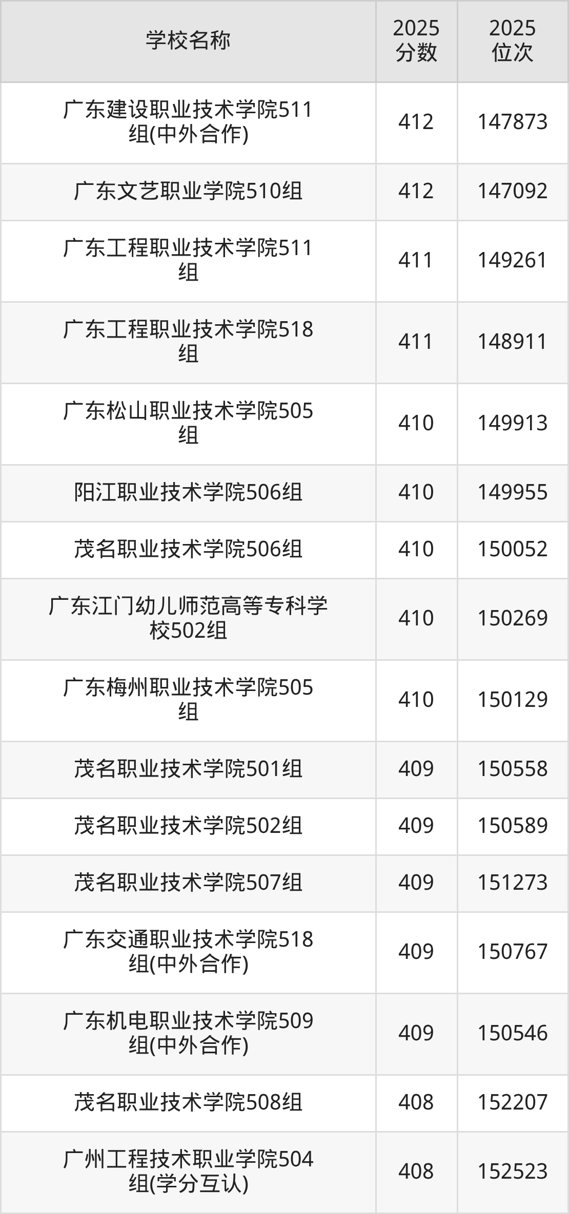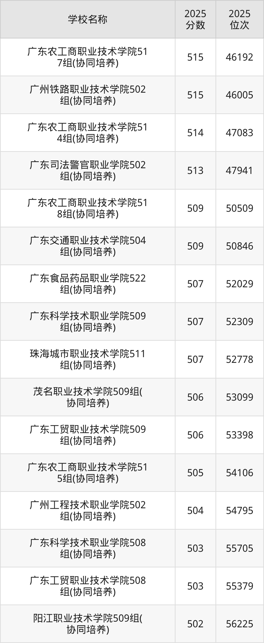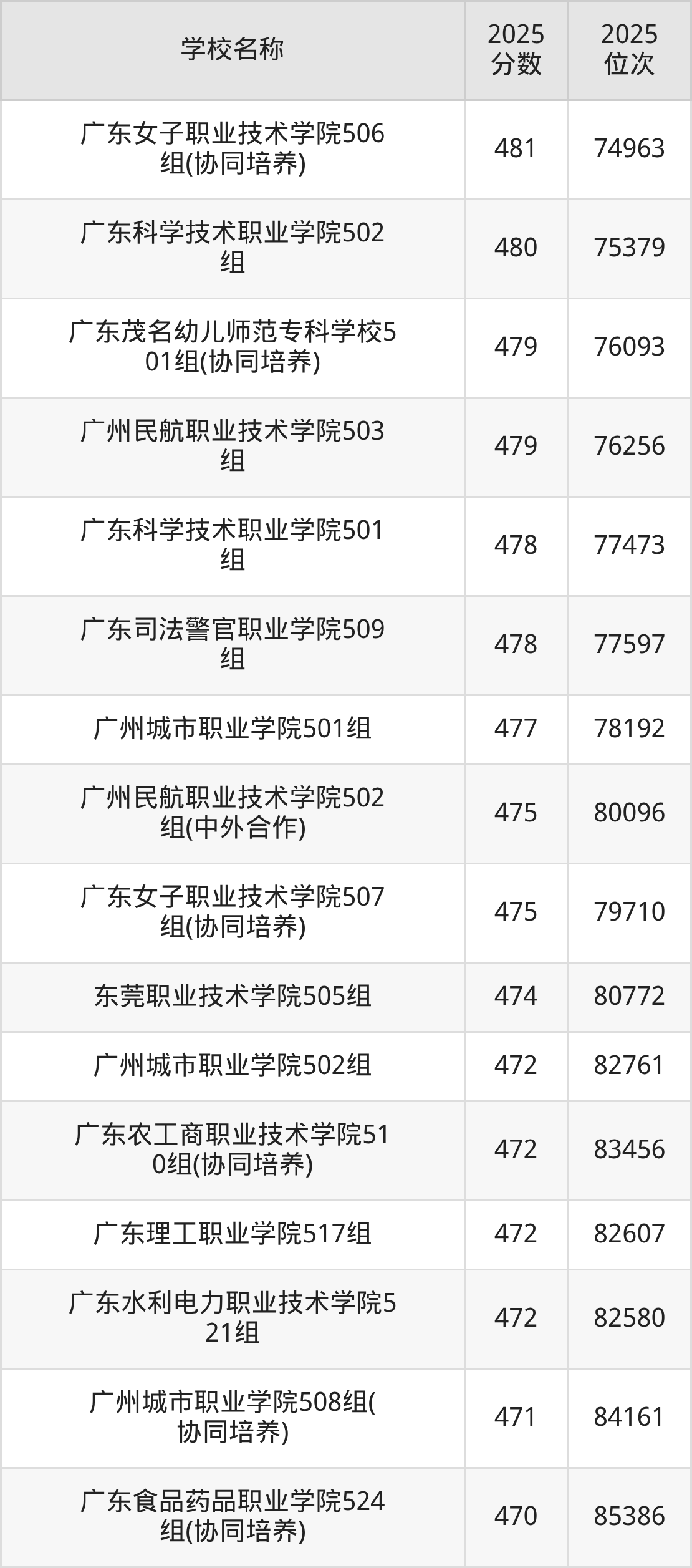 下文为2025年广东省公办专科大学在广东历史类录取分数线和位次排名表,供大家参考: