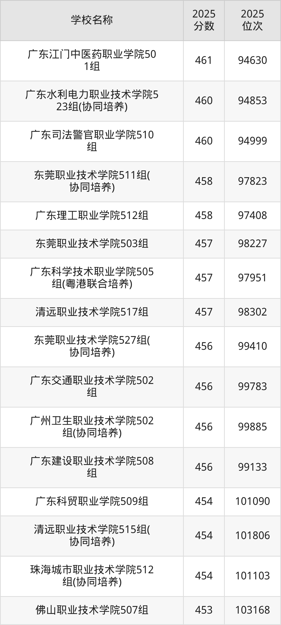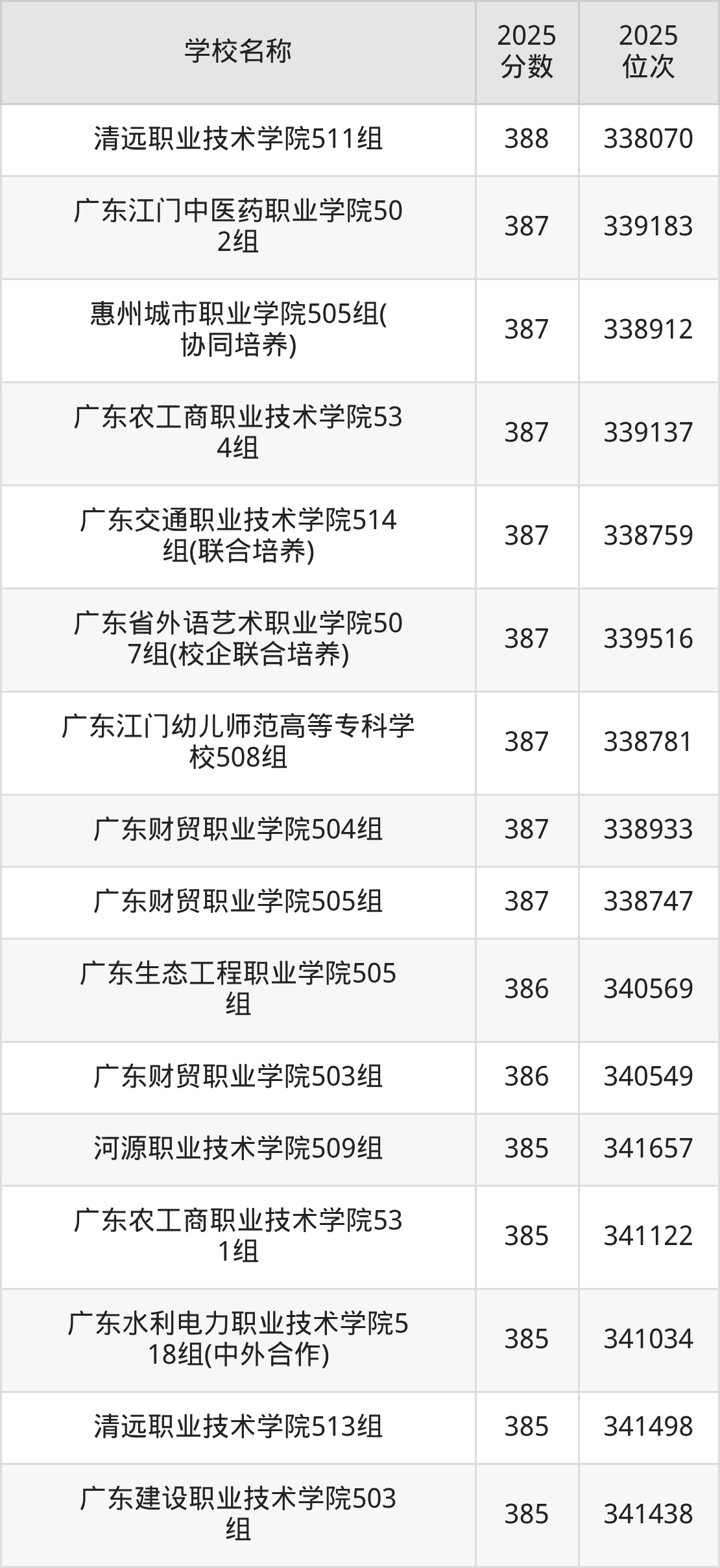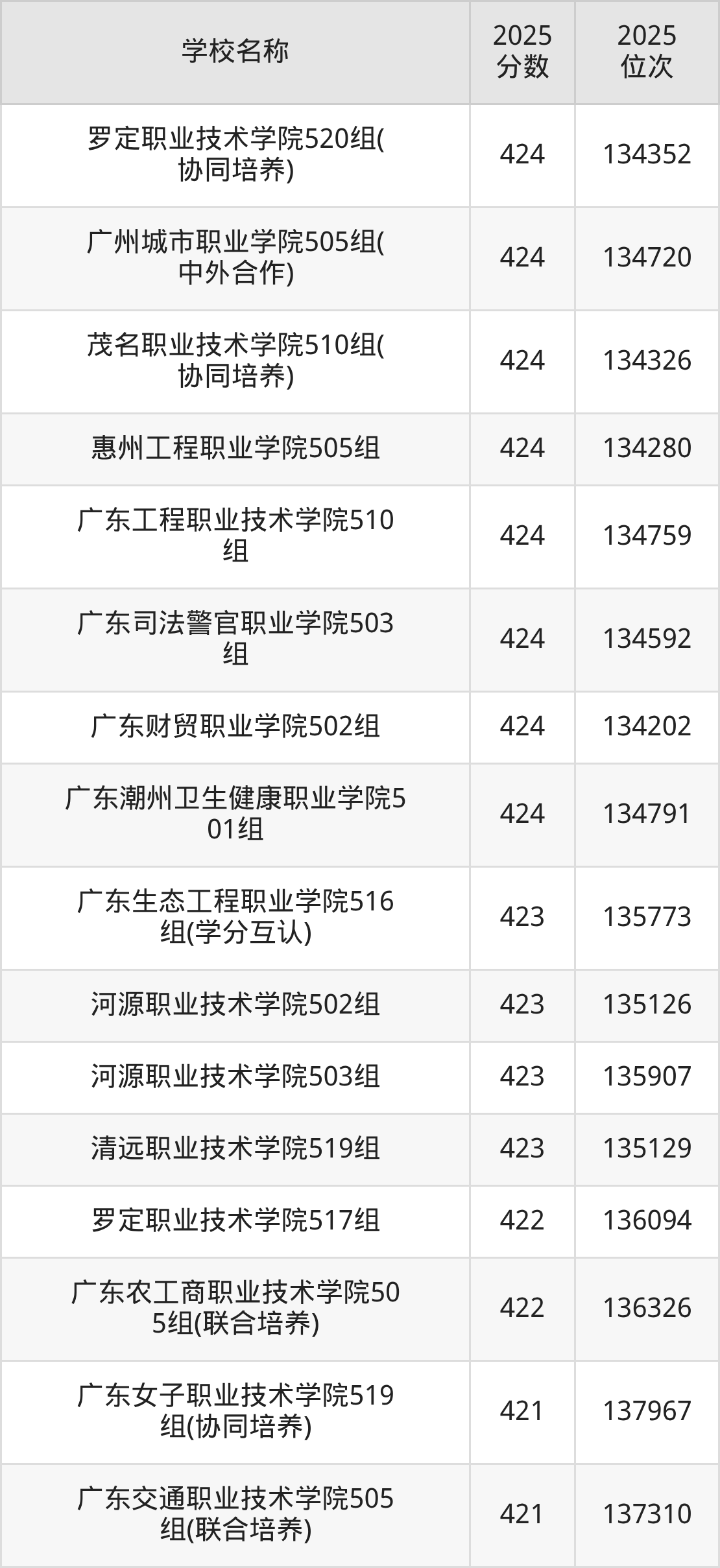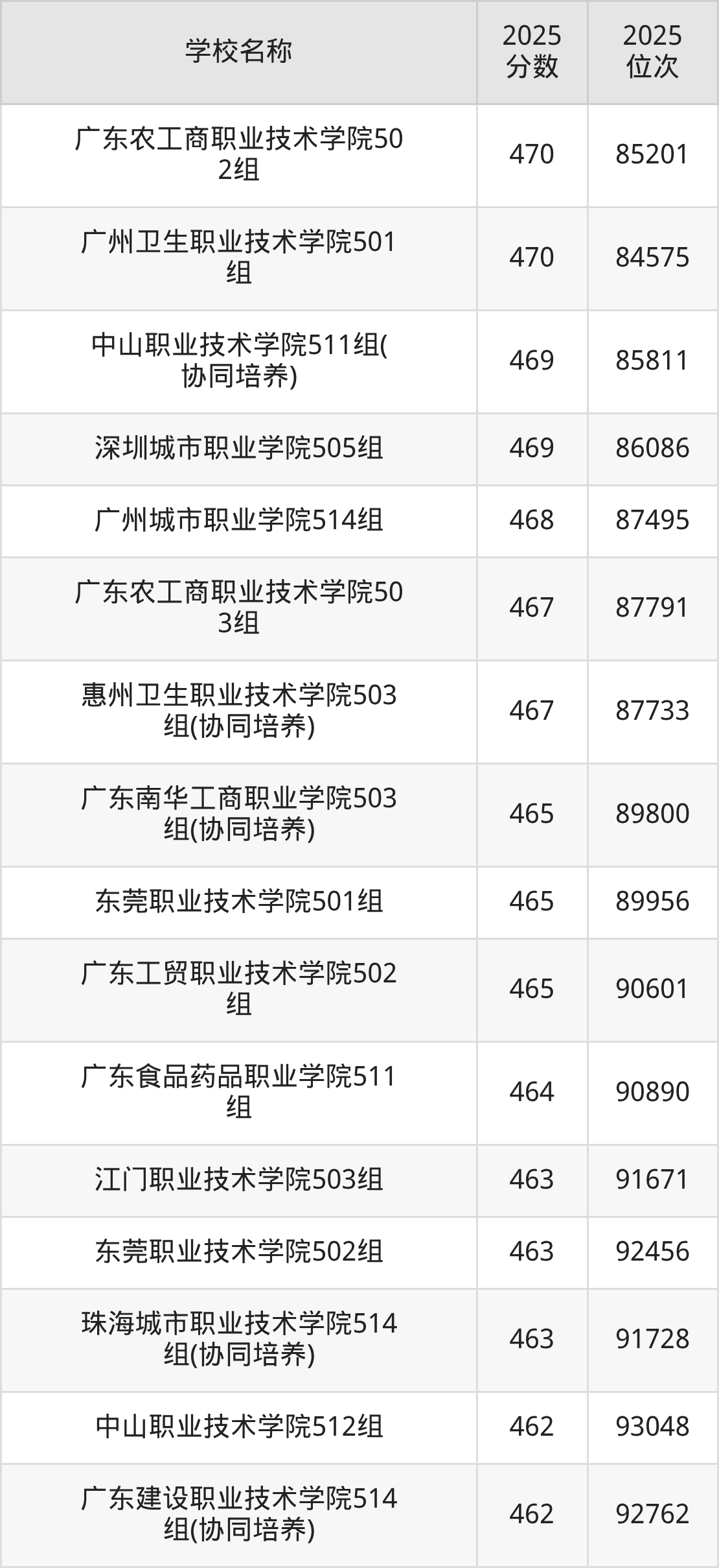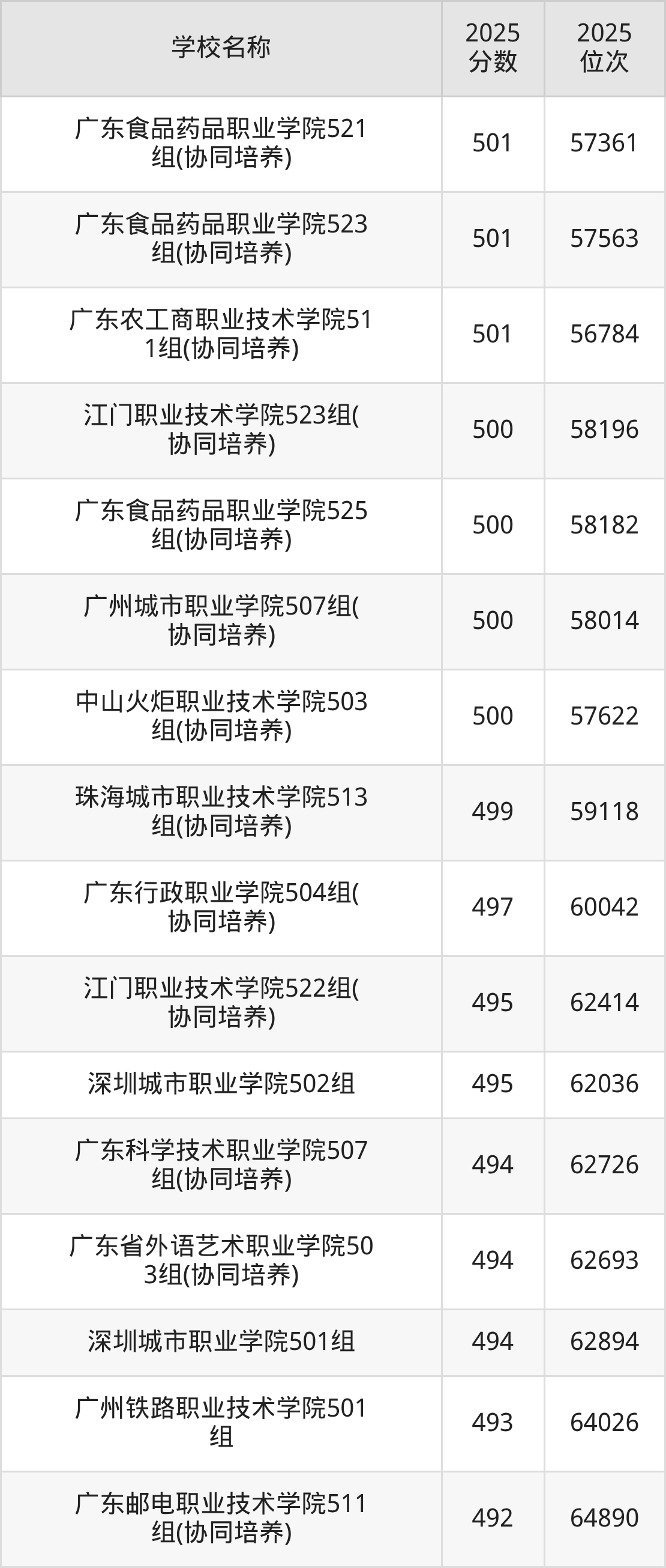 下文为2025年广东省公办专科大学在广东历史类录取分数线和位次排名表,供大家参考: