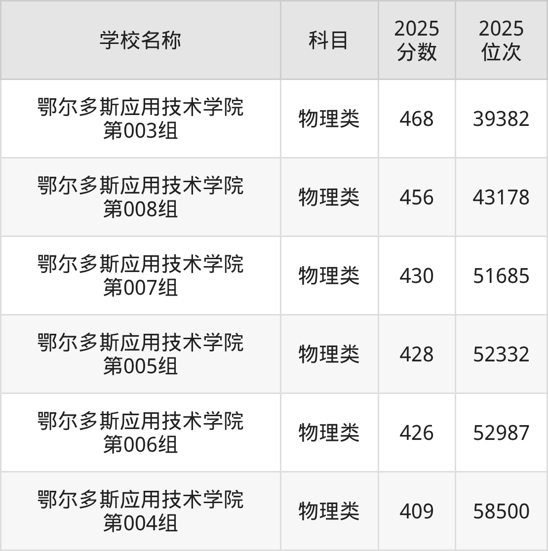 下文为2025年鄂尔多斯市本科大学在内蒙古物理类录取分数线和位次排名表,供大家参考: