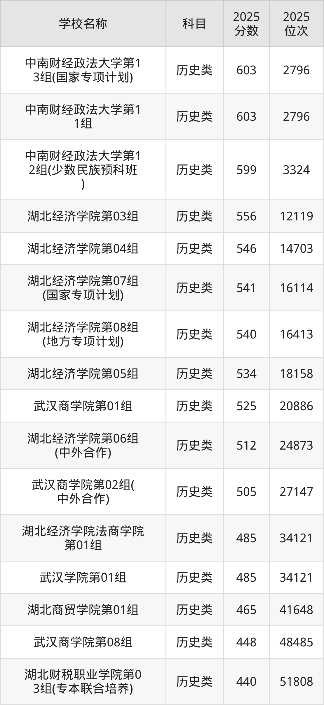 下文为2025年湖北省财经类大学在湖北历史类录取分数线和位次排名表,供大家参考: