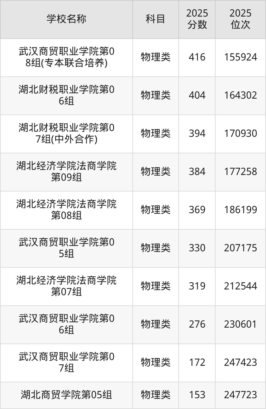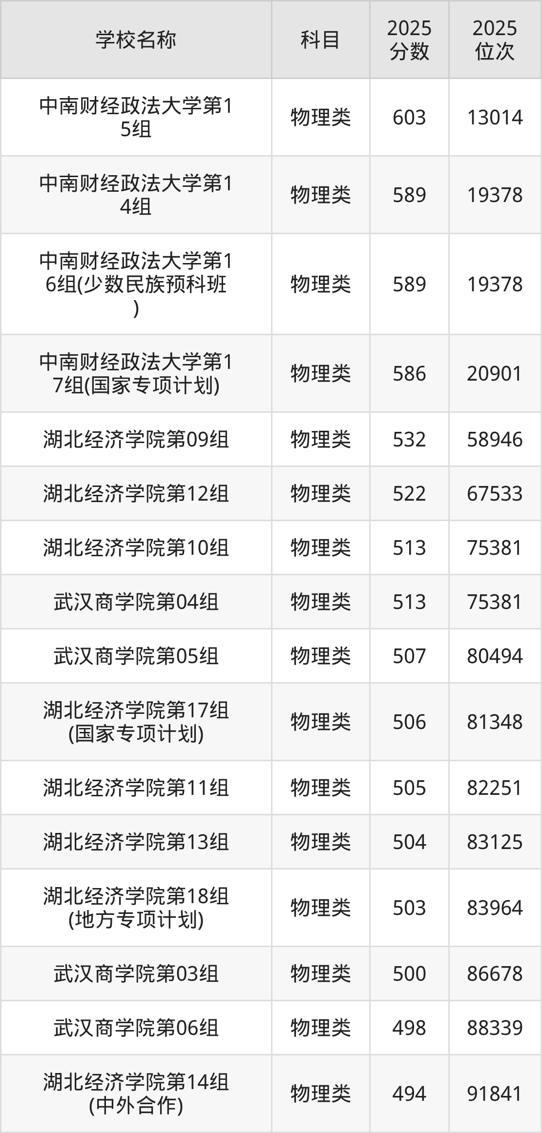 下文为2025年湖北省财经类大学在湖北物理类录取分数线和位次排名表,供大家参考: