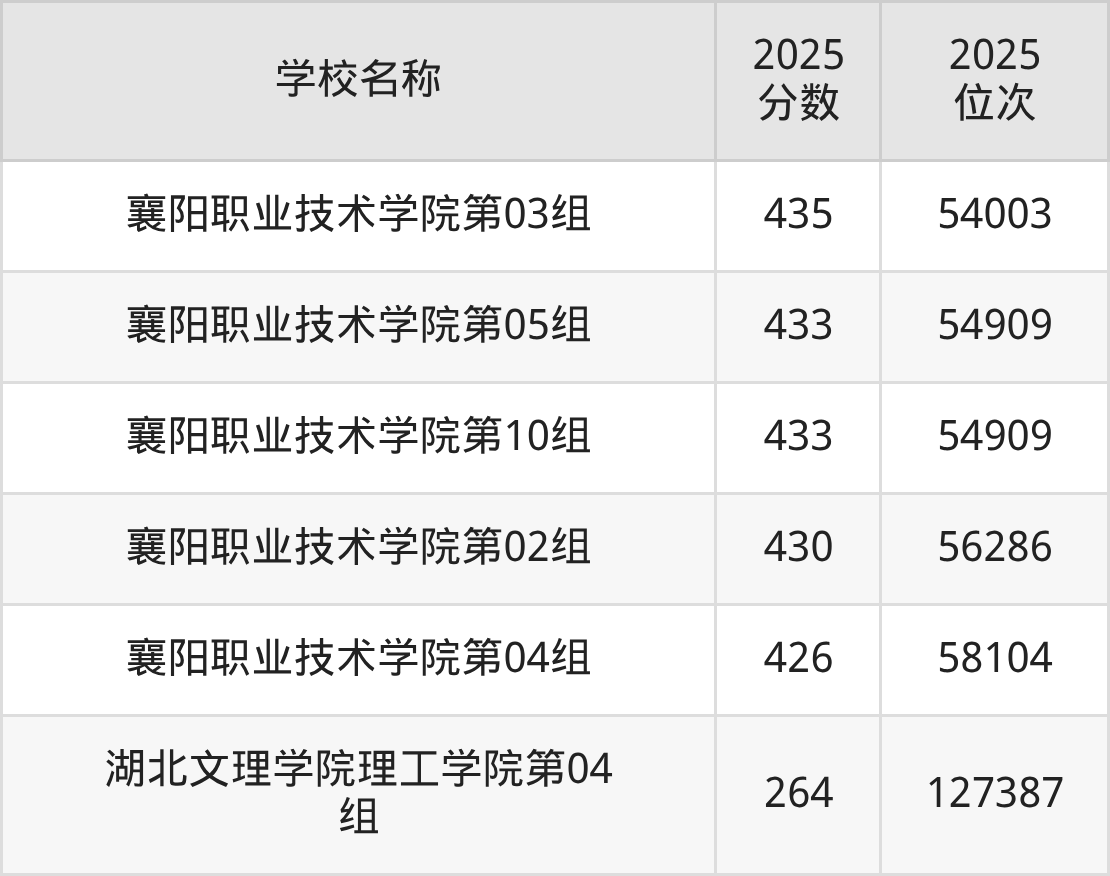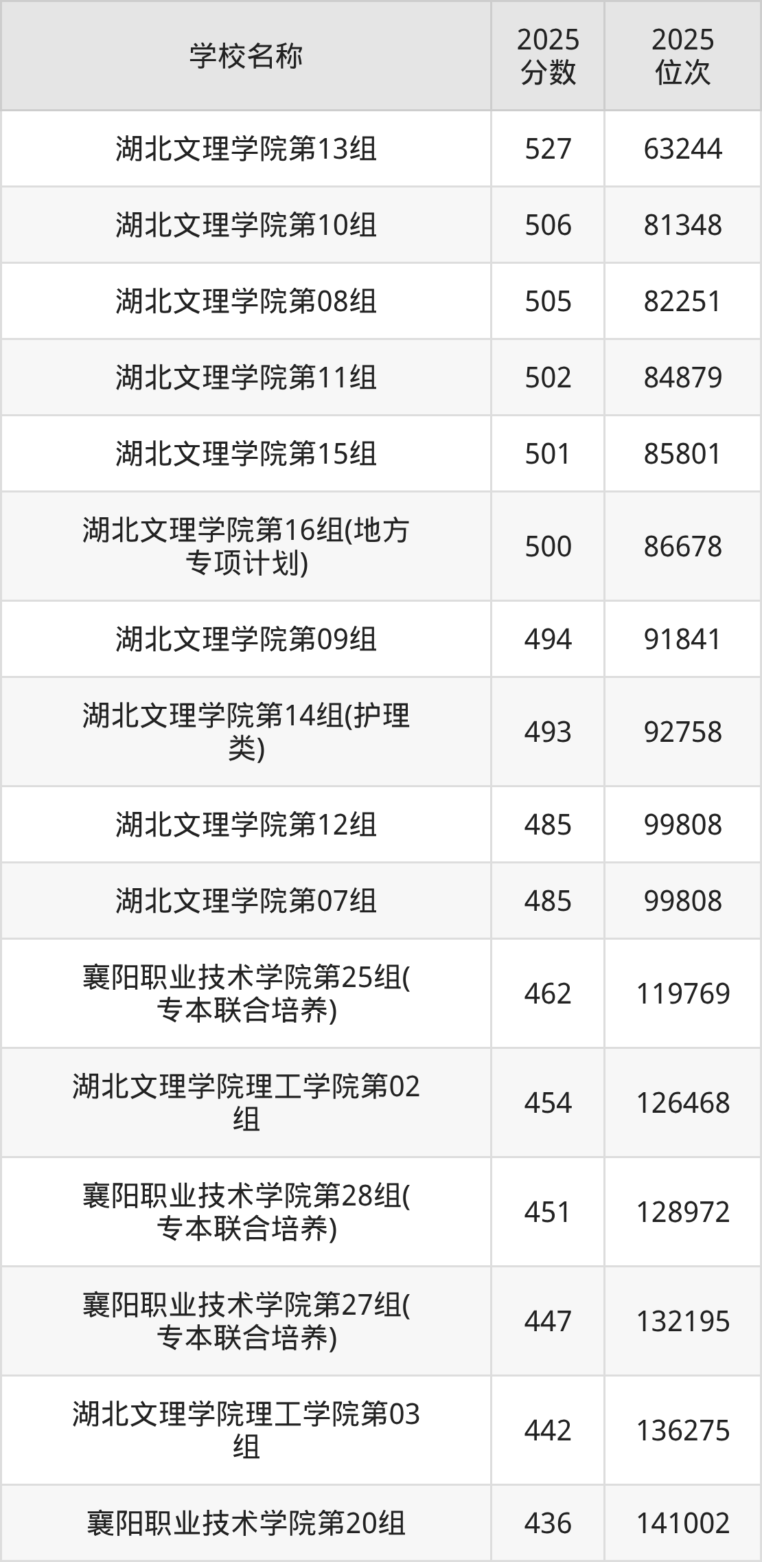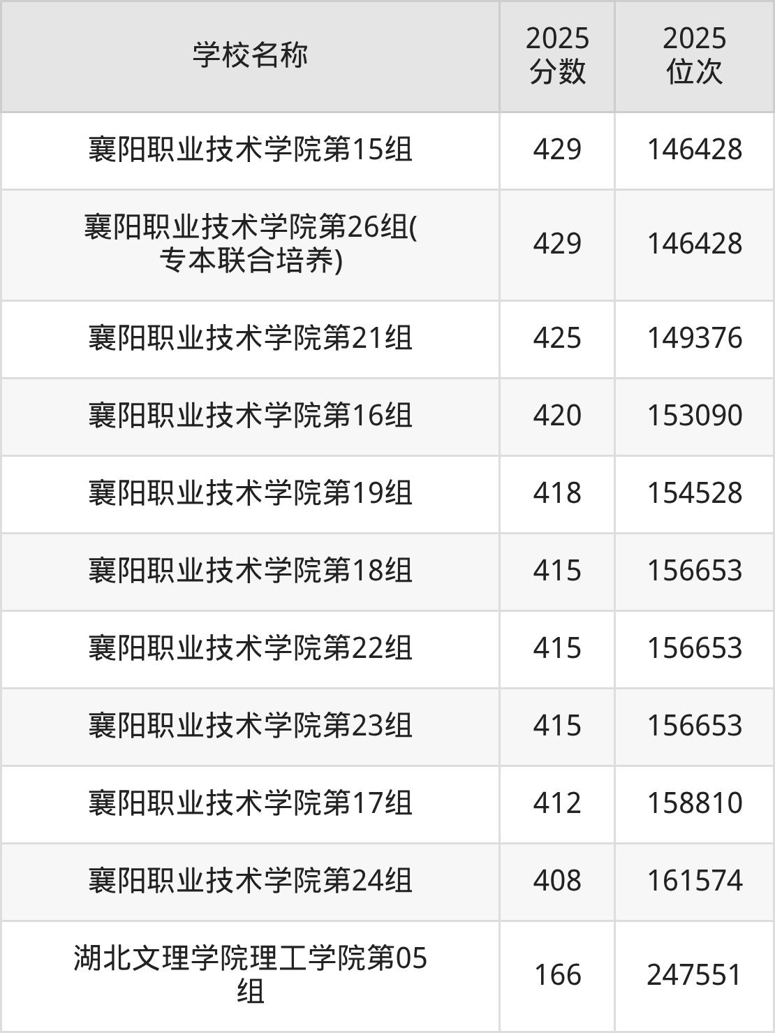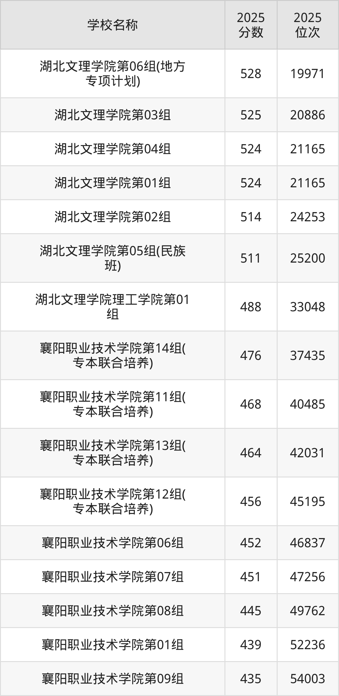 下文为2025年襄阳市本科大学在湖北历史类录取分数线和位次排名表,供大家参考: