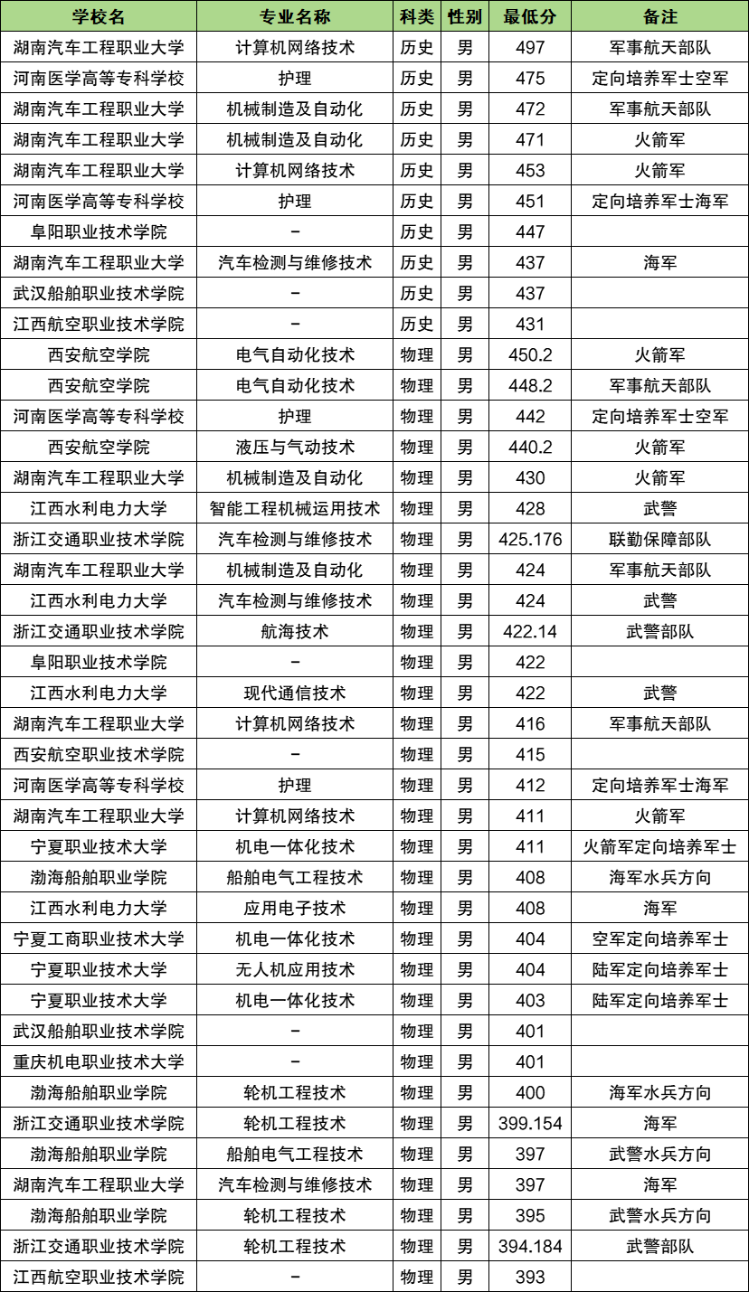 2025年河南定向士官录取分数线最低是:历史类431分、物理类393分,收分最低的学校为江西航空职业技术学院。此外历史类分数线最高的士官学校是湖南汽车工程职业大学,2025年最低分497分,对应专业为计算机网络技术(军事航天部队);物理类分数线最高的学校为西安航空学院(男),2025年最低分450.2分,对应专业为电气自动化技术(火箭军)。