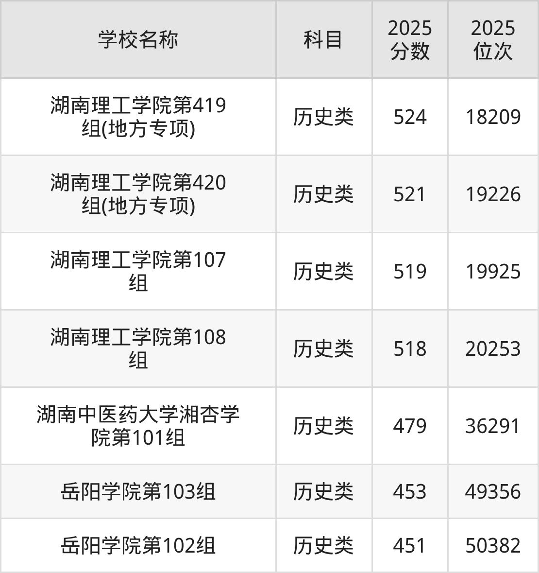下文为2025年岳阳市本科大学在湖南历史类录取分数线和位次排名表,供大家参考: