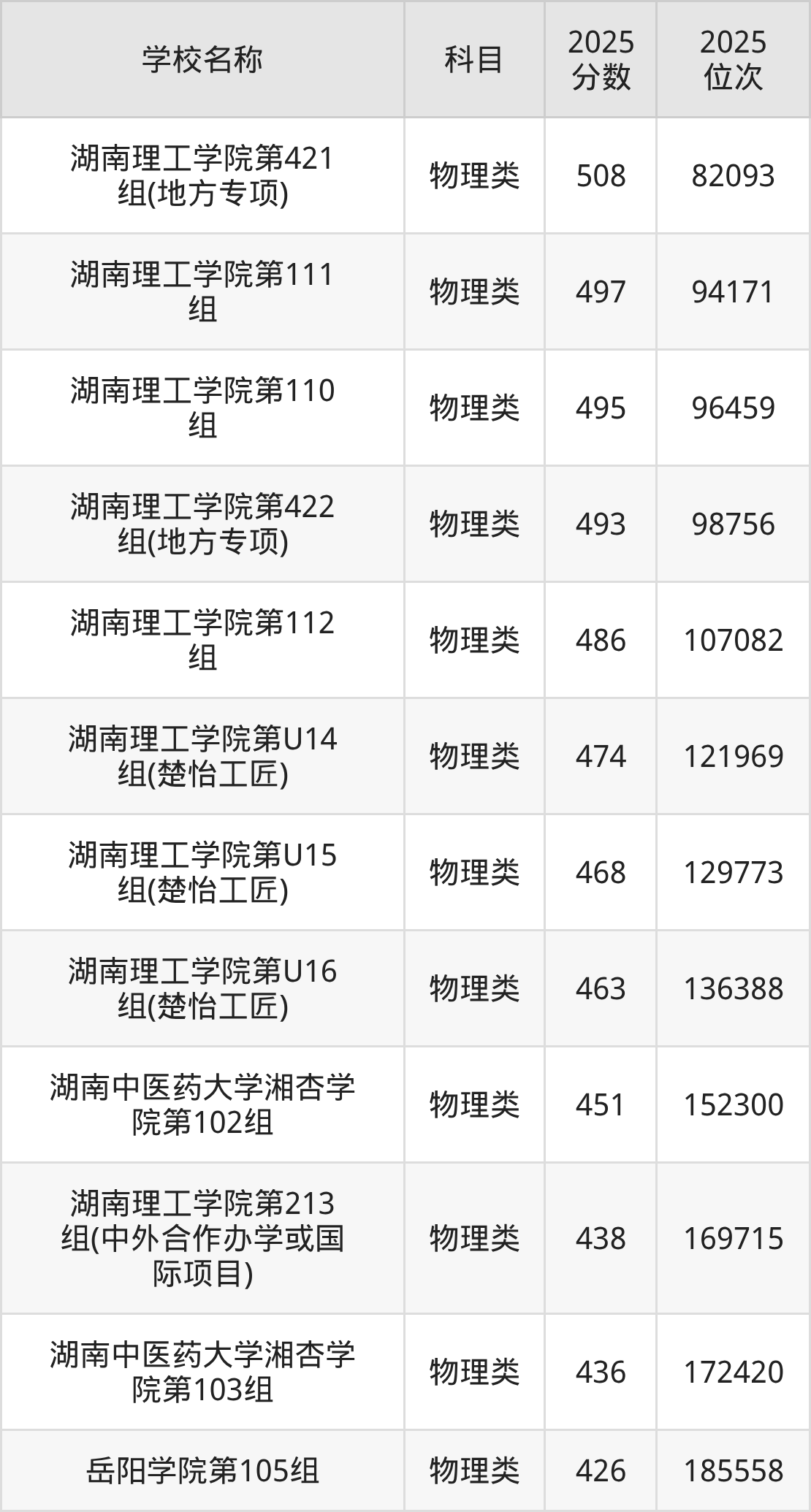 下文为2025年岳阳市本科大学在湖南物理类录取分数线和位次排名表,供大家参考: