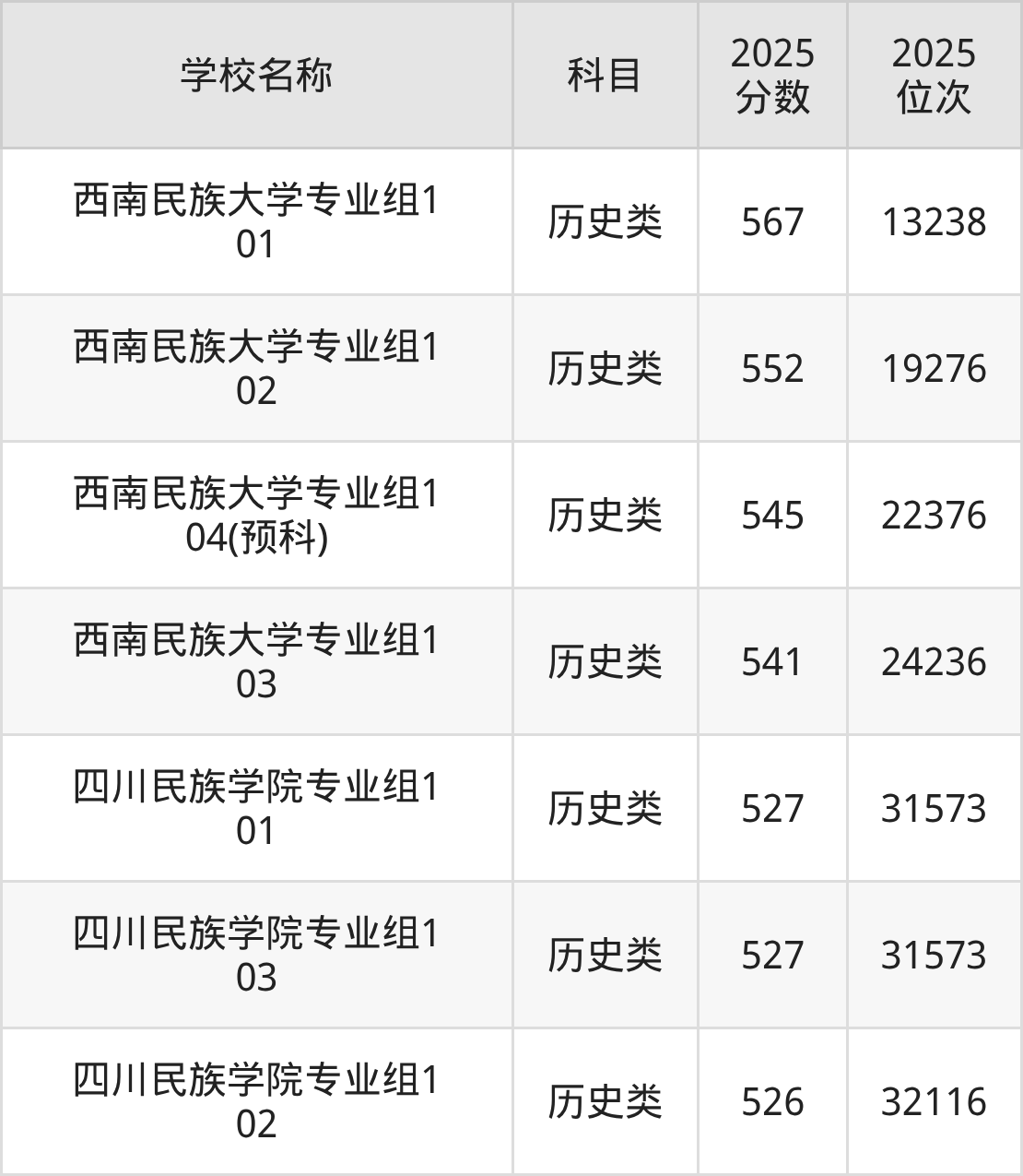 下文为2025年四川省民族类大学在四川历史类录取分数线和位次排名表,供大家参考: