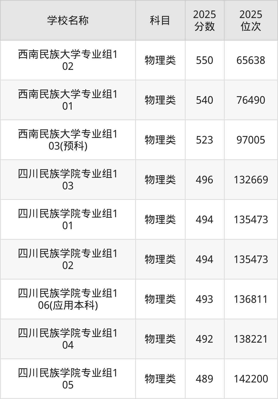 下文为2025年四川省民族类大学在四川物理类录取分数线和位次排名表,供大家参考: