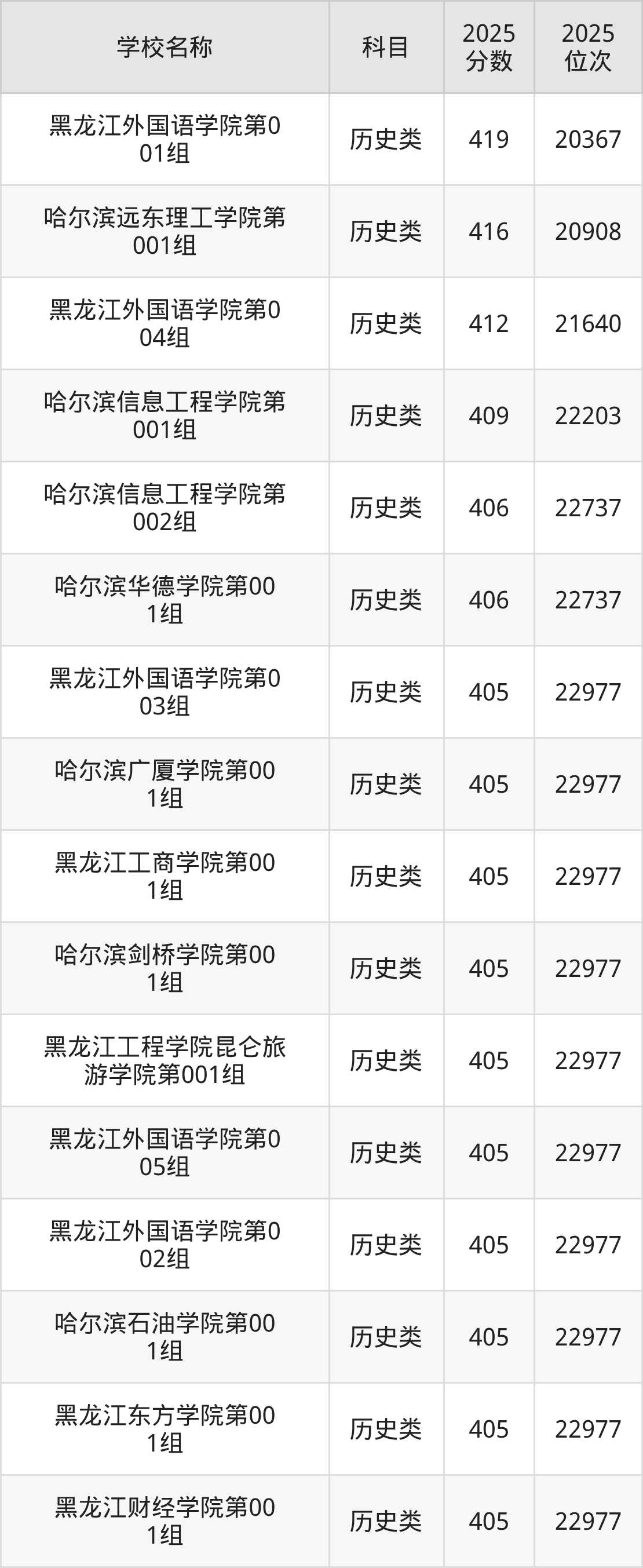 根据2025年哈尔滨民办二本大学在黑龙江省历史类招生录取分数线来看,哈尔滨历史类收分最低的民办二本大学为黑龙江外国语学院,录取分数线为405分。