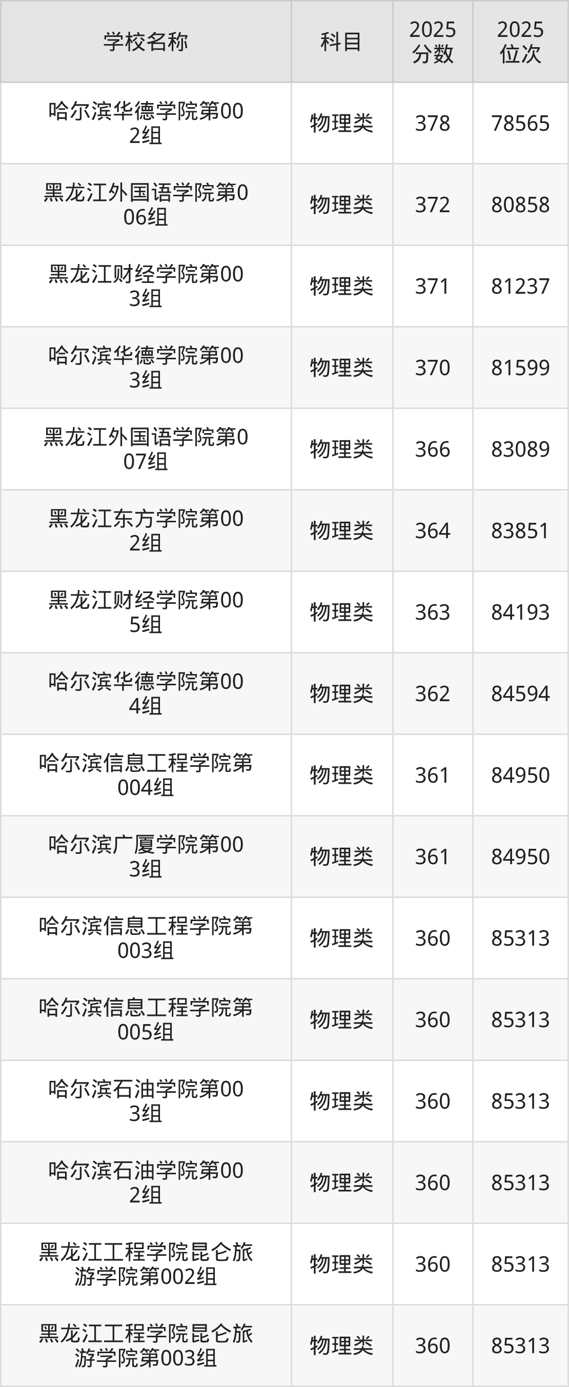 根据2025年哈尔滨民办二本大学在黑龙江省物理类招生录取分数线来看,哈尔滨物理类最难考、分数线最高的民办二本大学为哈尔滨华德学院,录取分数线为378分;哈尔滨物理类收分最低的民办二本大学为哈尔滨信息工程学院,录取分数线为360分。