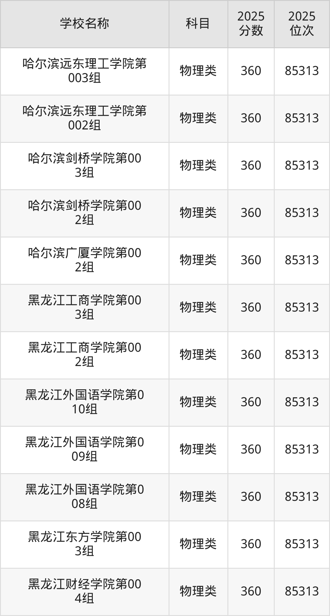 下文为2025年哈尔滨市民办二本大学在黑龙江物理类录取分数线和位次排名表,供大家参考: