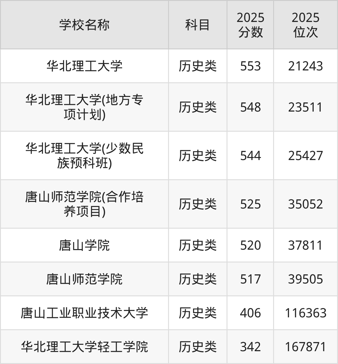 下文为2025年唐山市本科大学在河北历史类录取分数线和位次排名表,供大家参考: