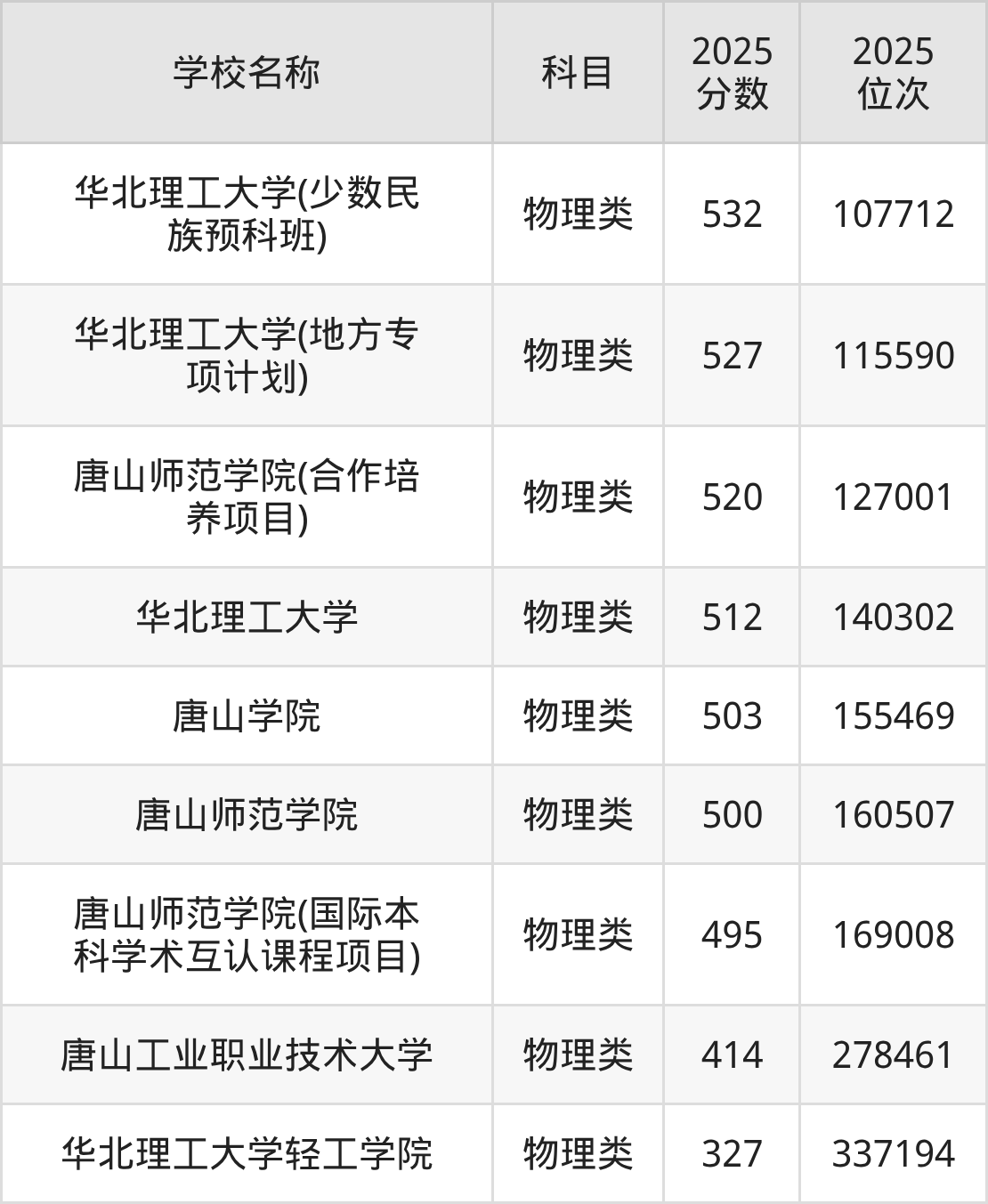 下文为2025年唐山市本科大学在河北物理类录取分数线和位次排名表,供大家参考: