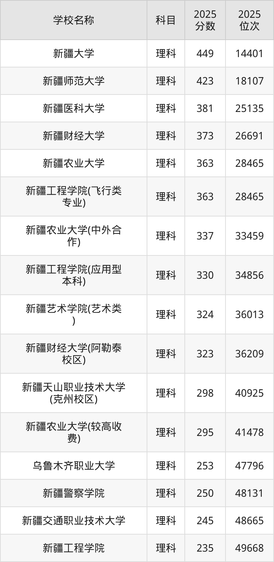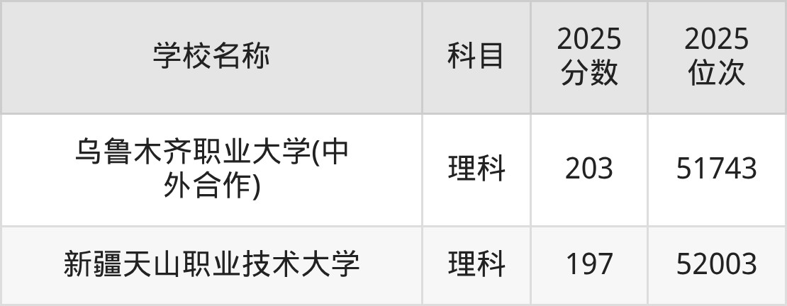 下文为2025年乌鲁木齐市本科大学在新疆理科录取分数线和位次排名表,供大家参考: