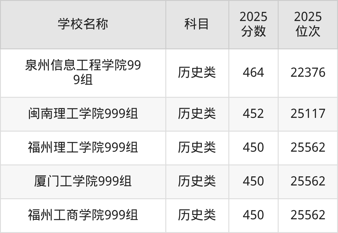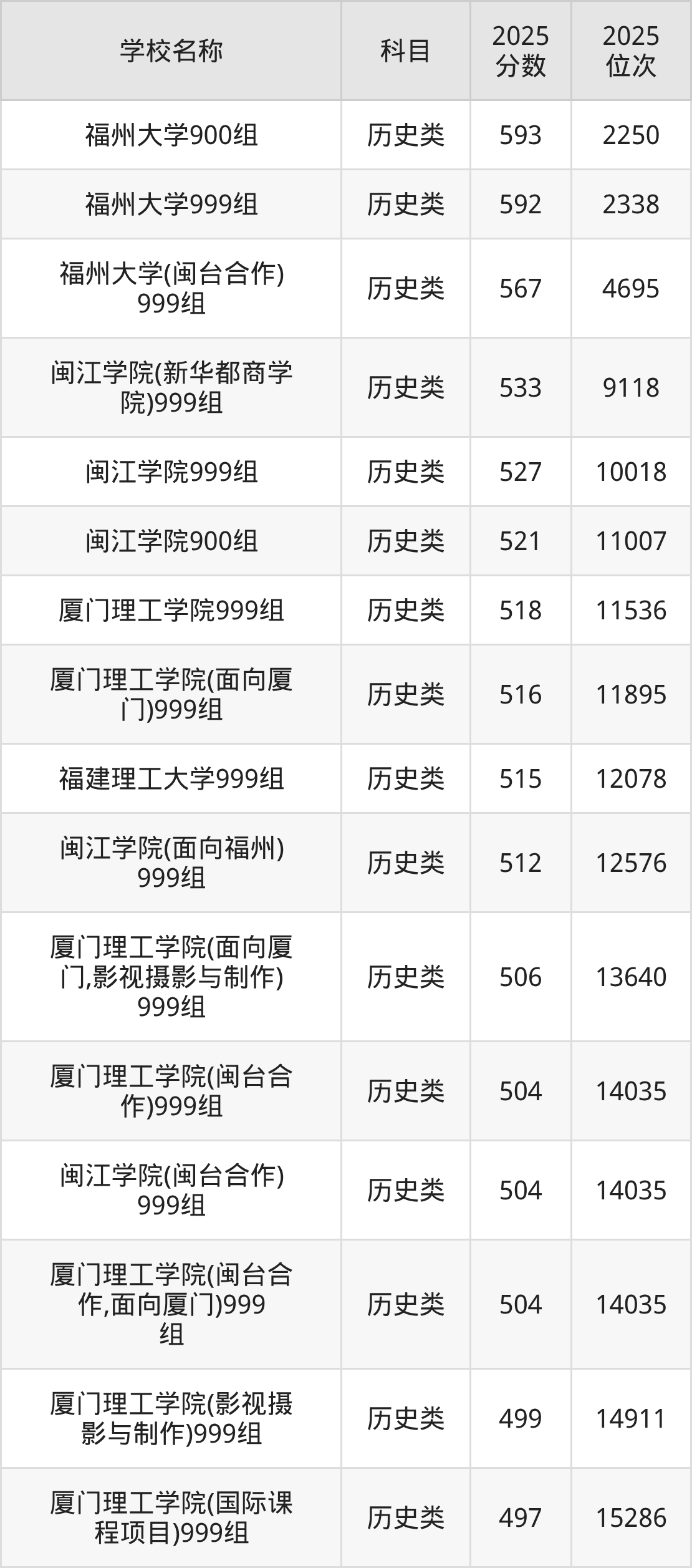 下文为2025年福建省理工类大学在福建历史类录取分数线和位次排名表,供大家参考: