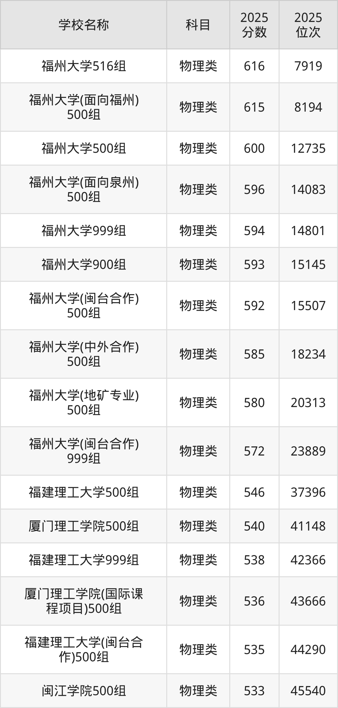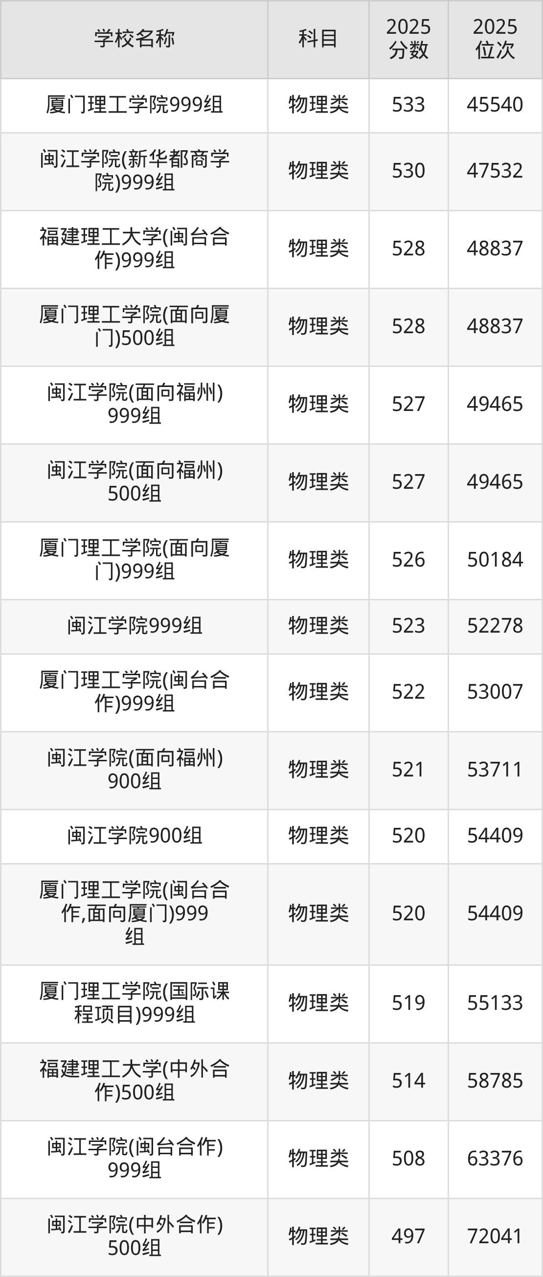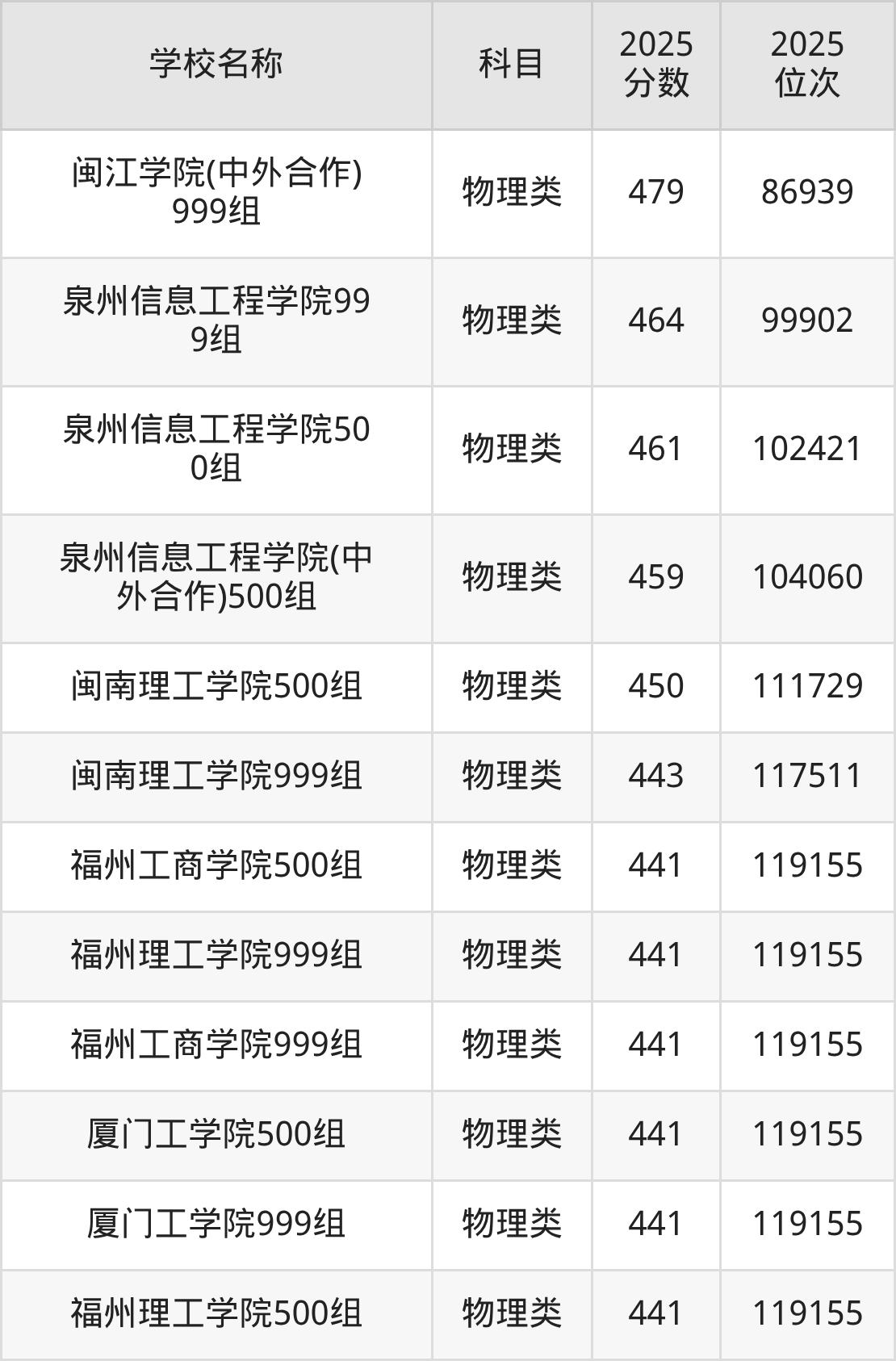 下文为2025年福建省理工类大学在福建物理类录取分数线和位次排名表,供大家参考: