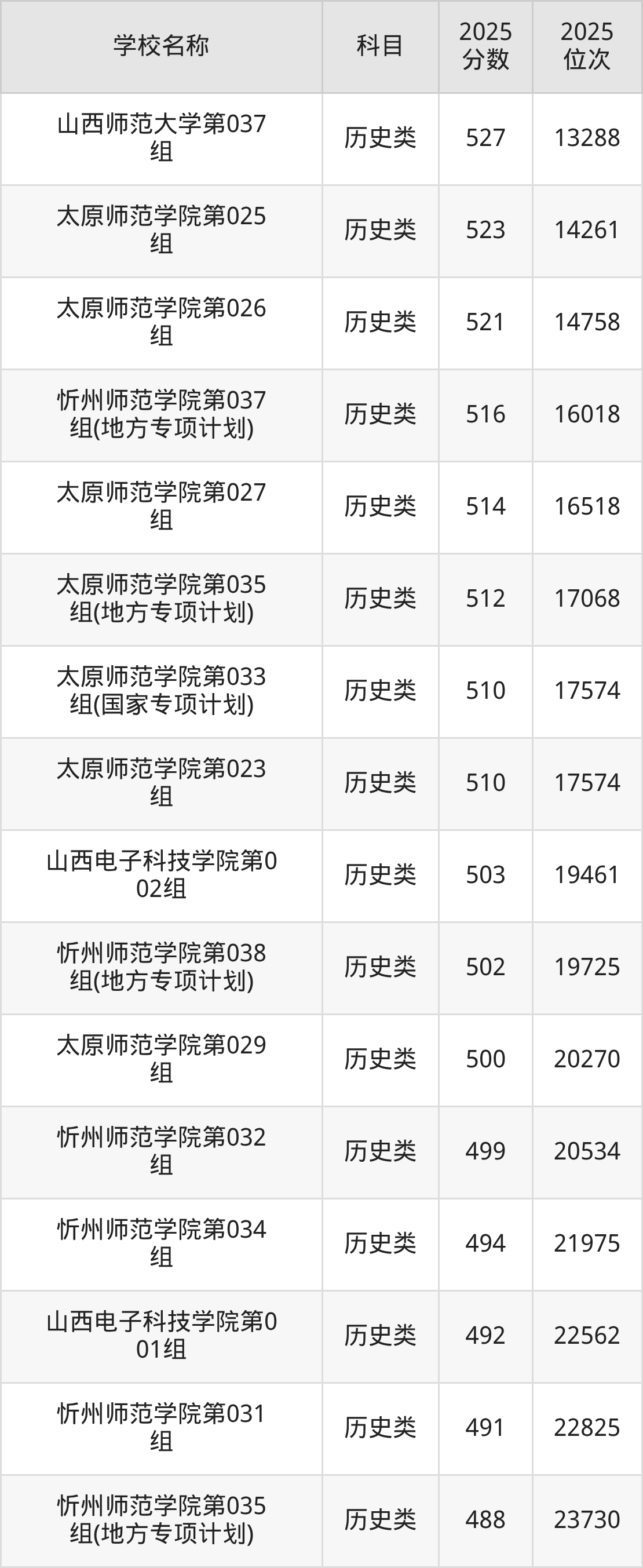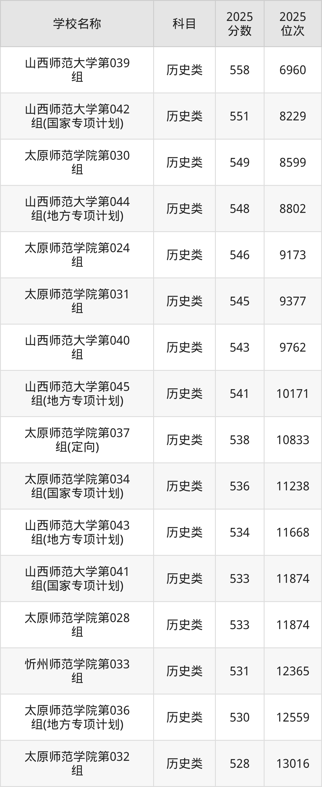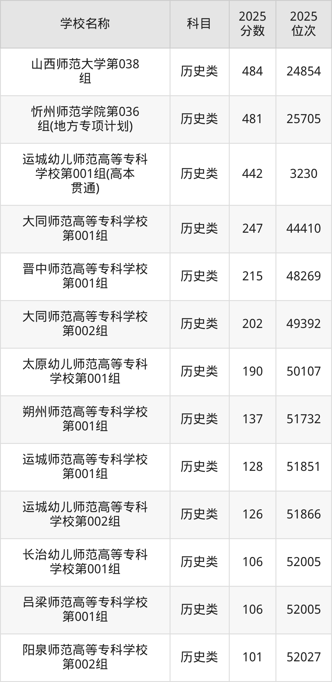 下文为2025年山西省师范类大学在山西历史类录取分数线和位次排名表,供大家参考: