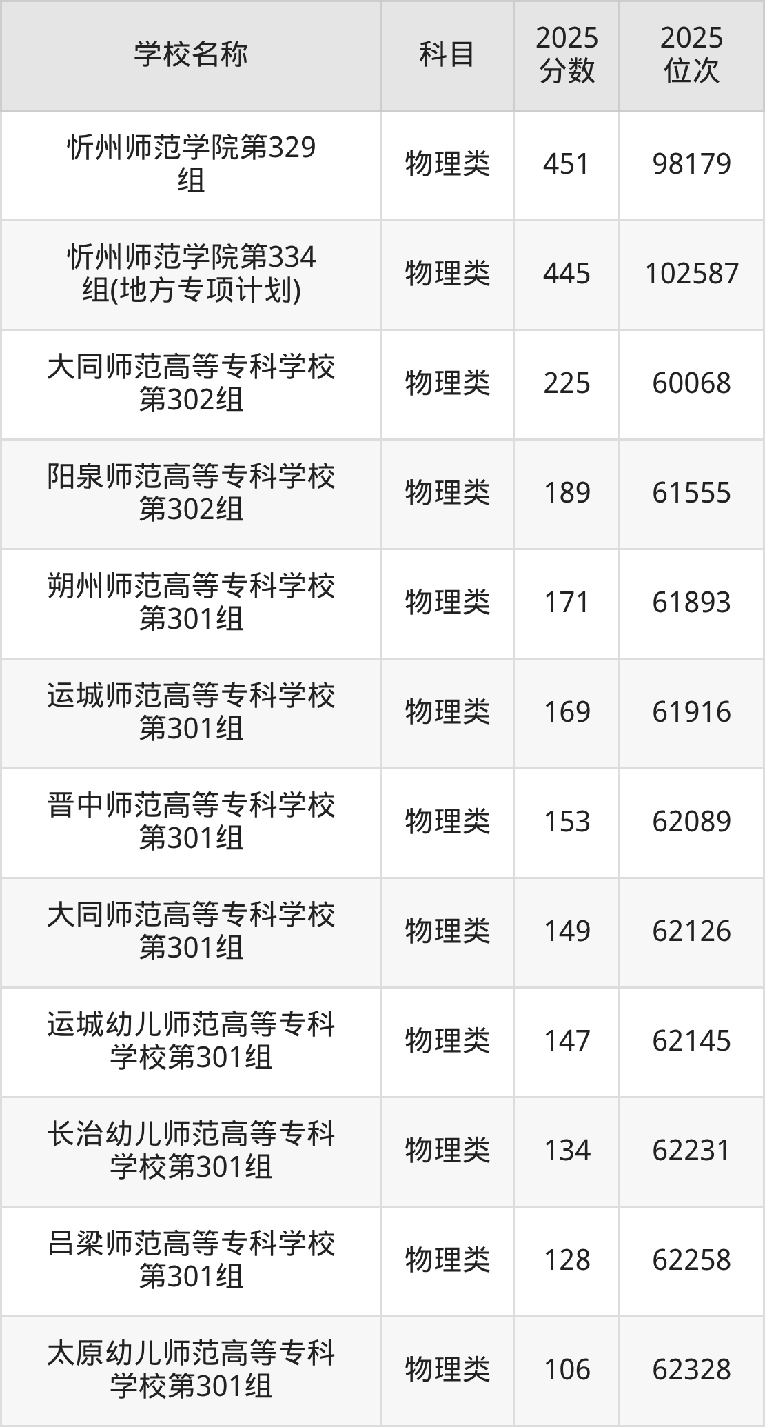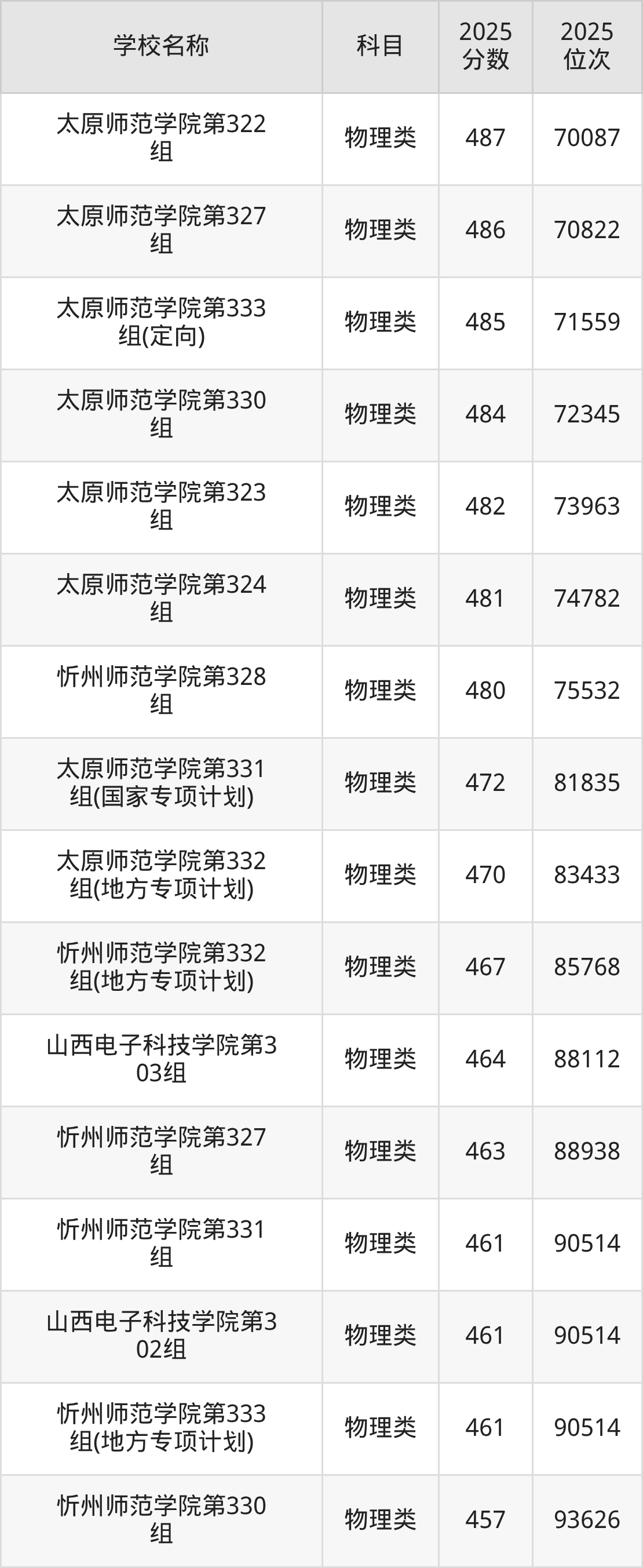 下文为2025年山西省师范类大学在山西物理类录取分数线和位次排名表,供大家参考: