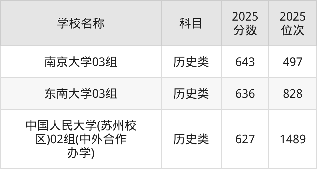 下文为2025年江苏省985大学在江苏历史类录取分数线和位次排名表,供大家参考: