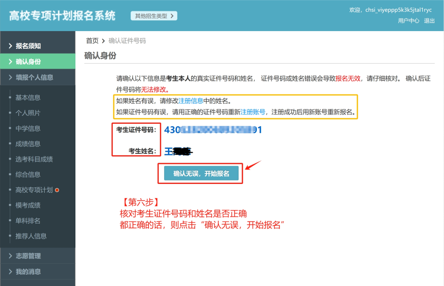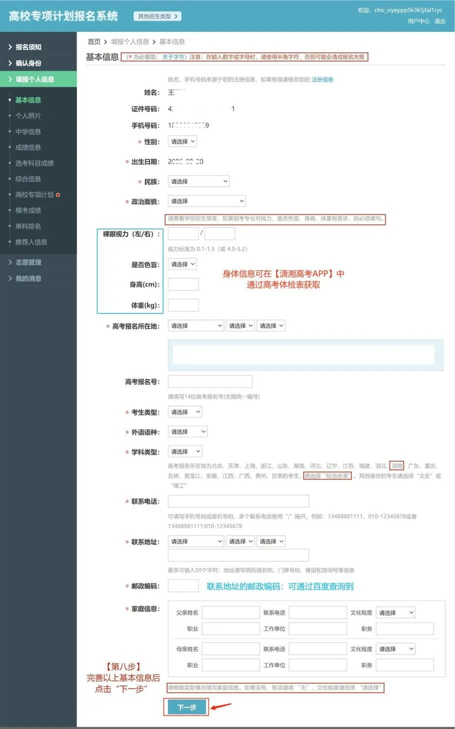 认真根据页面提示填写好考生的基本信息,确认无误后,点击“下一步”。