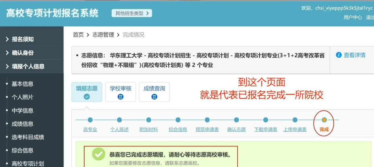 操作确认:上传完成后,系统显示“恭喜你已经完整志愿填报,请耐心等待志愿高校审核”,即完成2026年高校专项计划全部报名流程,考生可在系统中查看报名状态。