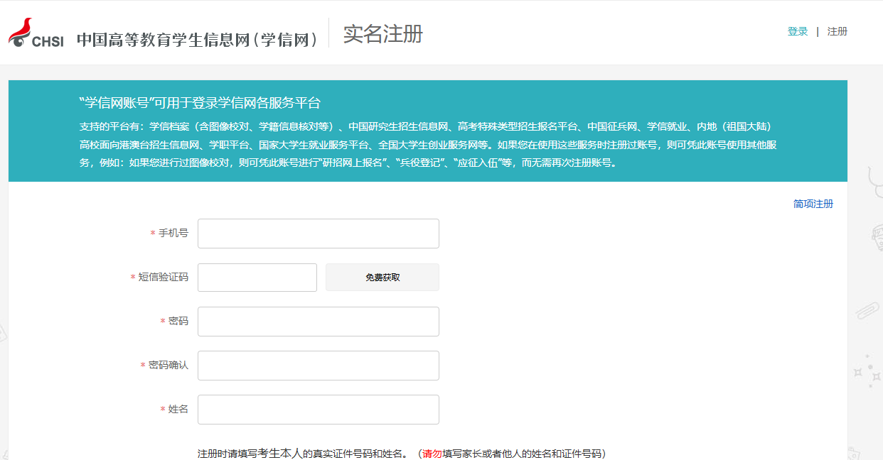 操作:首次登录需用考生本人身份证号注册学信网账号,完成手机号绑定与实名认证;已有学信网账号可直接登录。