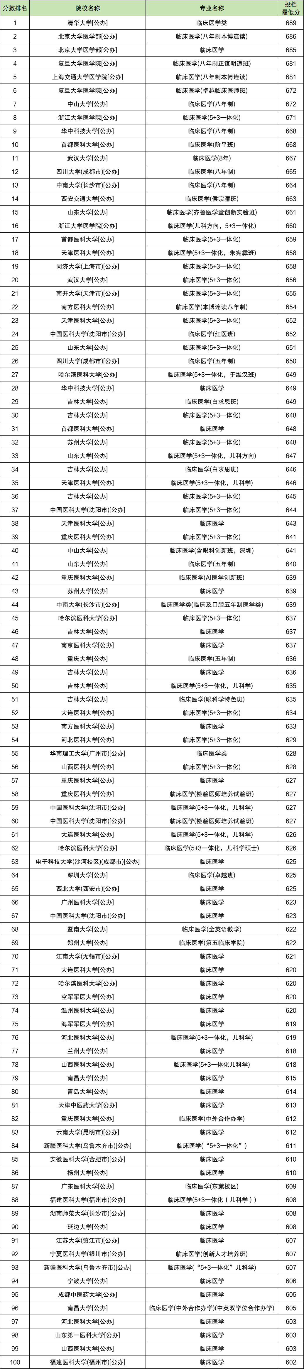 由于篇幅限制,以下为2025年临床医学各校录取分数线前100强: