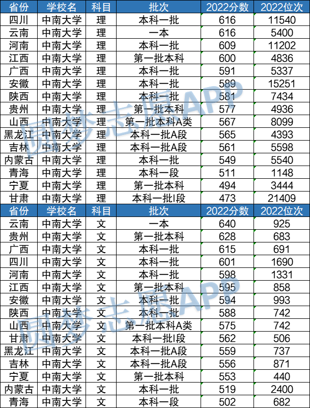 可以看到,2022年中南大学在旧高考文理省份的理科招生中,录取分数线最高的省份是四川省616分,最低的是甘肃省473分。