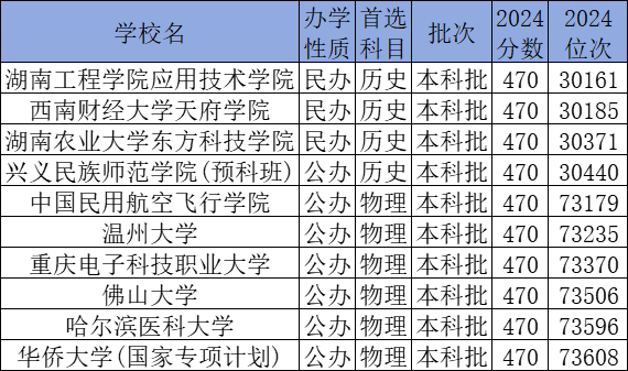 历史类470分能上的有湖南工程学院应用技术学院、西南财经大学天府学院、湖南农业大学东方科技学院、兴义民族师范学院(预科班);物理类470分能上的有中国民用航空飞行学院、温州大学、重庆电子科技职业大学、佛山大学、哈尔滨医科大学等。