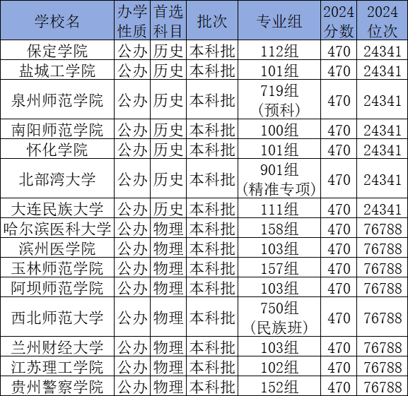 历史类470分能上的有保定学院、盐城工学院、泉州师范学院、南阳师范学院等;物理类470分能上的有哈尔滨医科大学、滨州医学院、玉林师范学院、阿坝师范学院等。