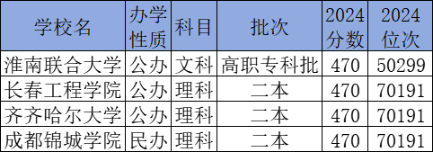 文科470分能上的大学有淮南联合大学;理科470分能上的大学有长春工程学院、齐齐哈尔大学、成都锦城学院。