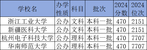 文科470分能上的大学有浙江工业大学、新疆医科大学;理科470分能上的大学有杭州电子科技大学、华南师范大学。