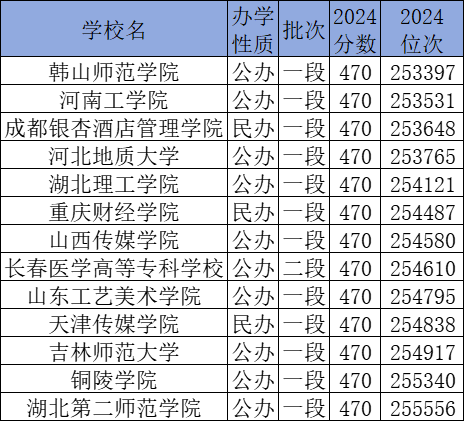 2024年山东470分对应排名:253397名~255556名,因此建议2025年高考位次排名在25.4万名左右的同学报考这些学校。