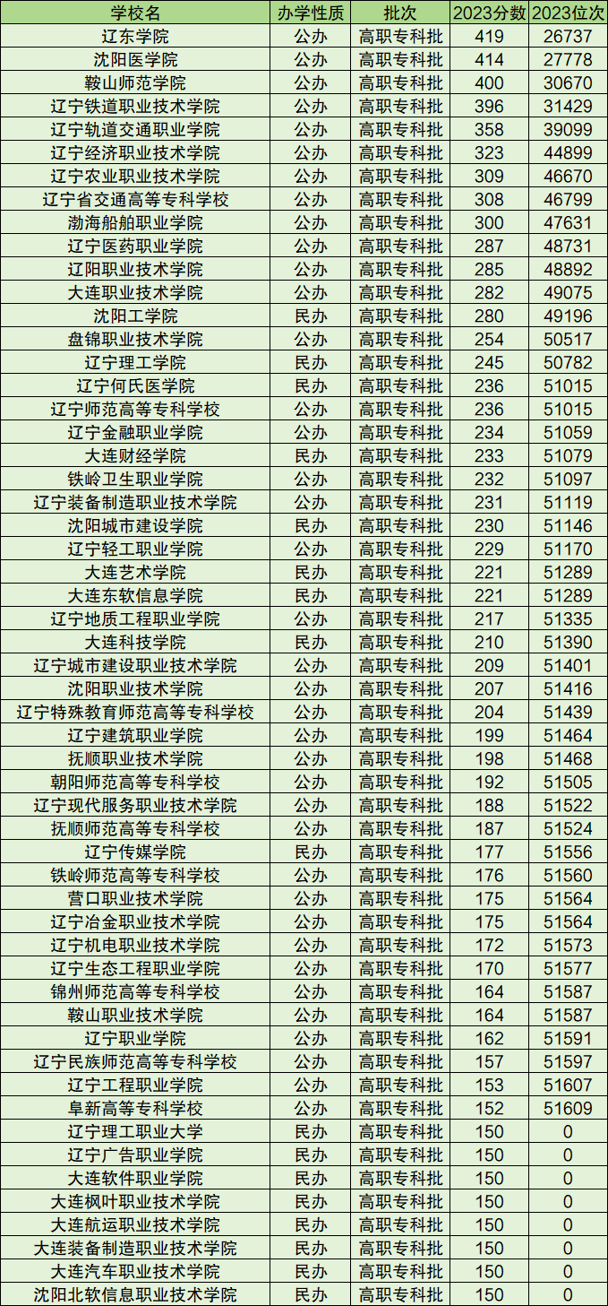 2023年辽宁各大学专科录取分数线位于150分到419分之间,对应位次从51609名+到26737名。分数线最高的是武汉职业技术学院第03组,分数线最低的有沈阳北软信息职业技术学院、大连汽车职业技术学院、大连装备制造职业技术学院等,最低分公办大专是阜新高等专科学校,2023年最低分是152分。
