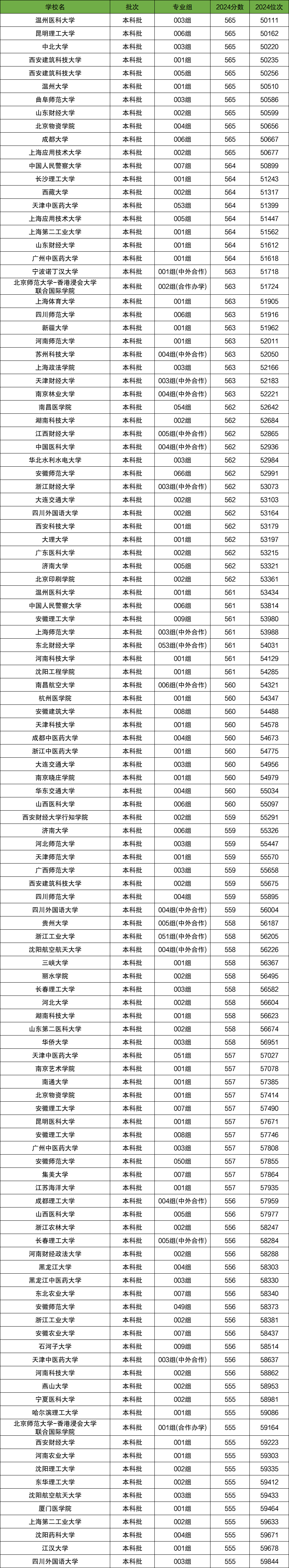 1、565分对应位次50111-50677。有温州医科大学、昆明理工大学、中北大学、西安建筑科技大学、温州大学、曲阜师范大学、山东财经大学、北京物资学院、成都大学、上海应用技术大学。
