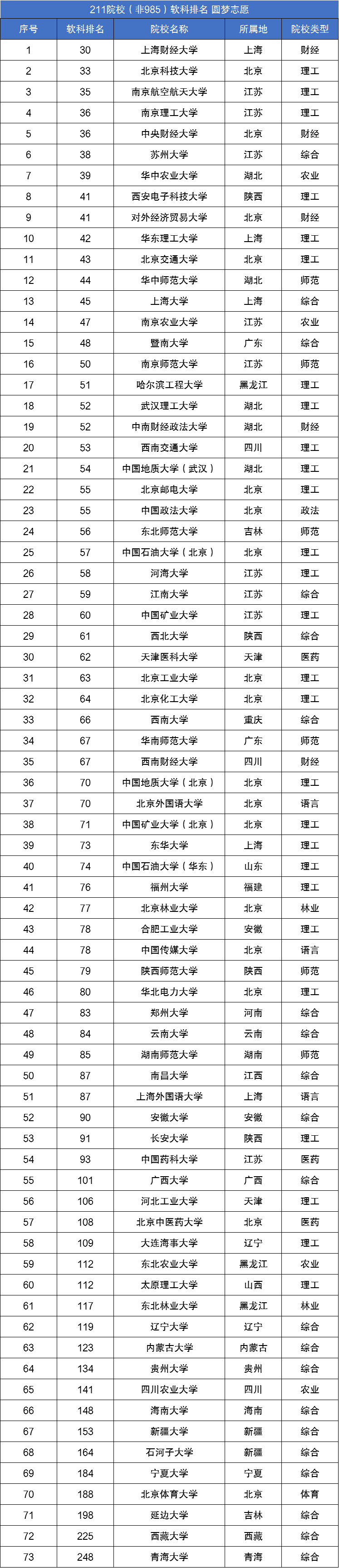 可以看到,在单纯的211工程大学排名中,各所院校的实力排名跨度很大,顶级211院校排名强过部分985院校,而末端211院校则低至200名之后。