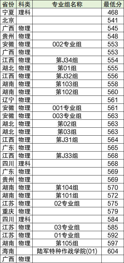 2024年陆军特种作战学院提前批录取分数线是468分到604分,录取最低在宁夏理科、录取最高在海南(01组)。