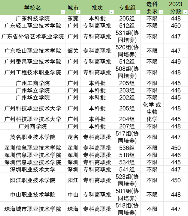专科高职批,503组,2023在广东最低录取分数线为448分。